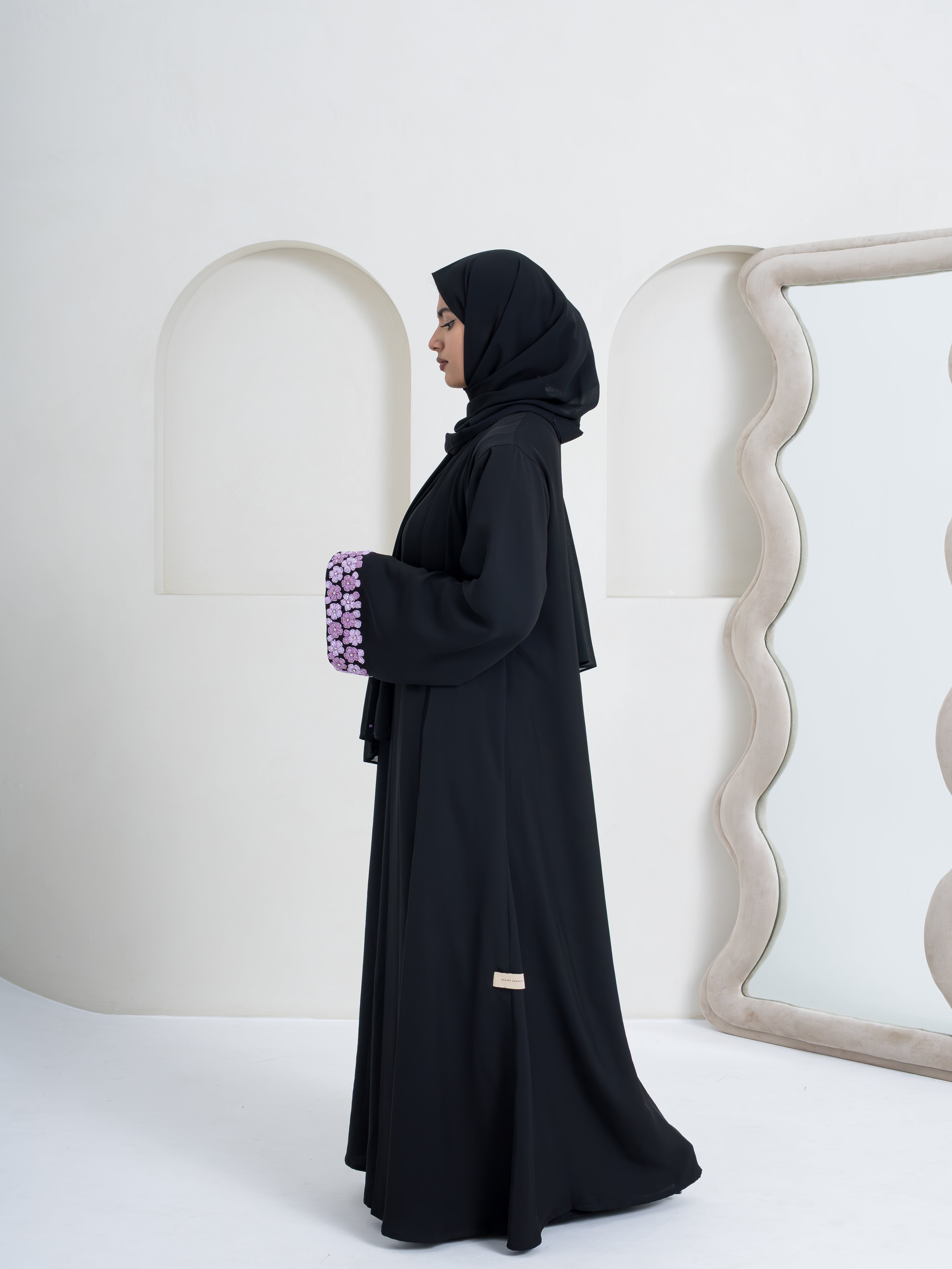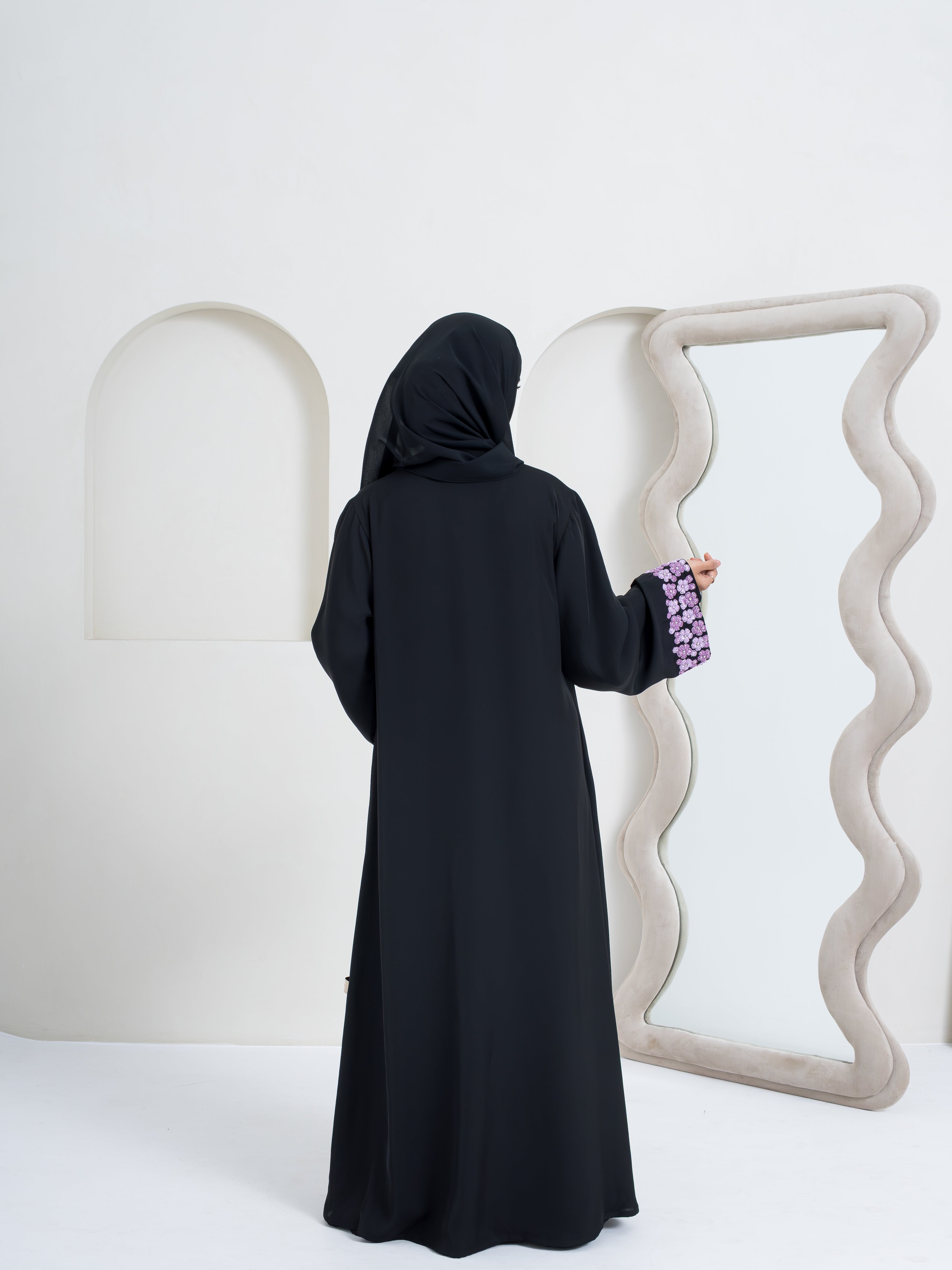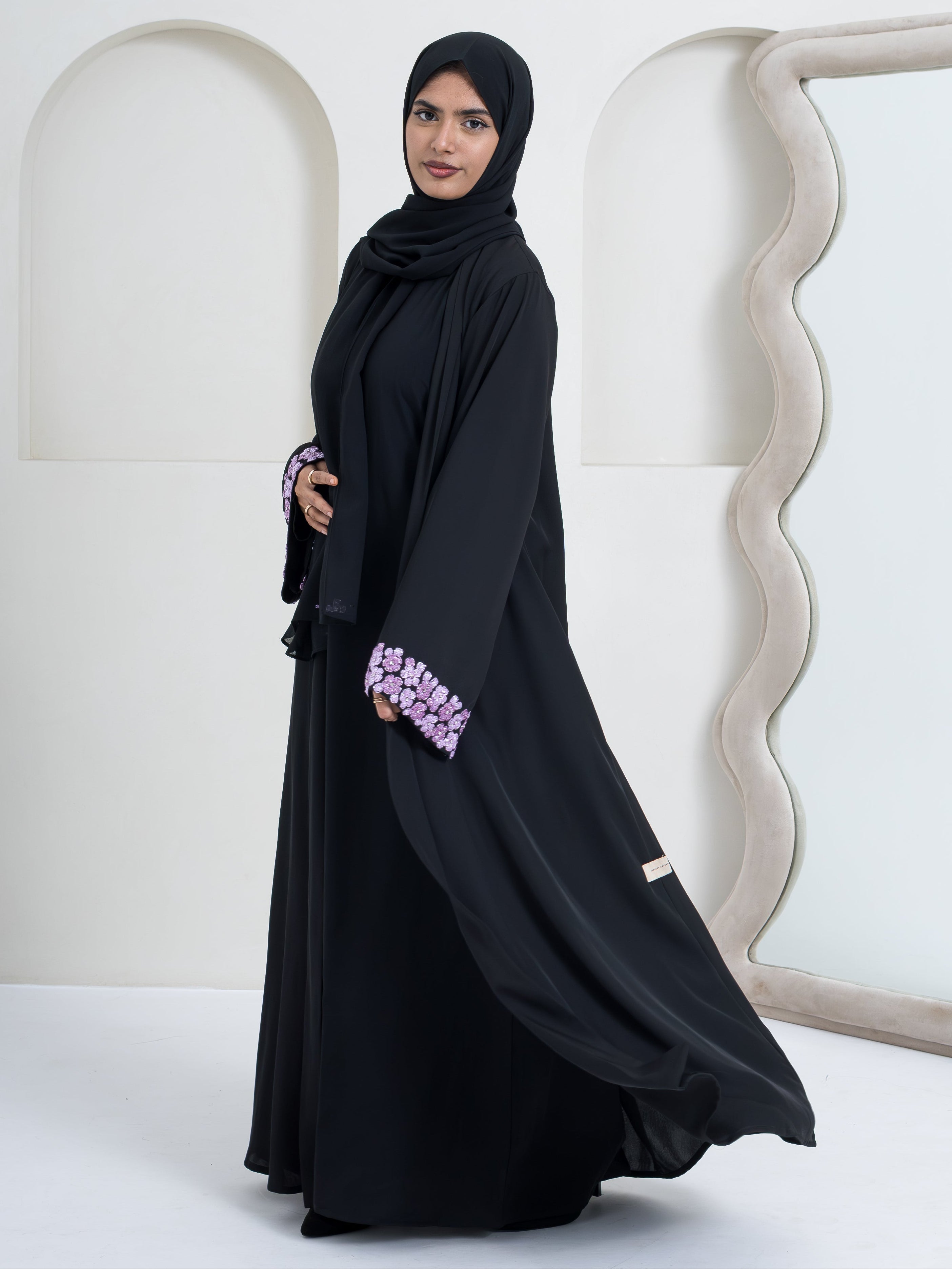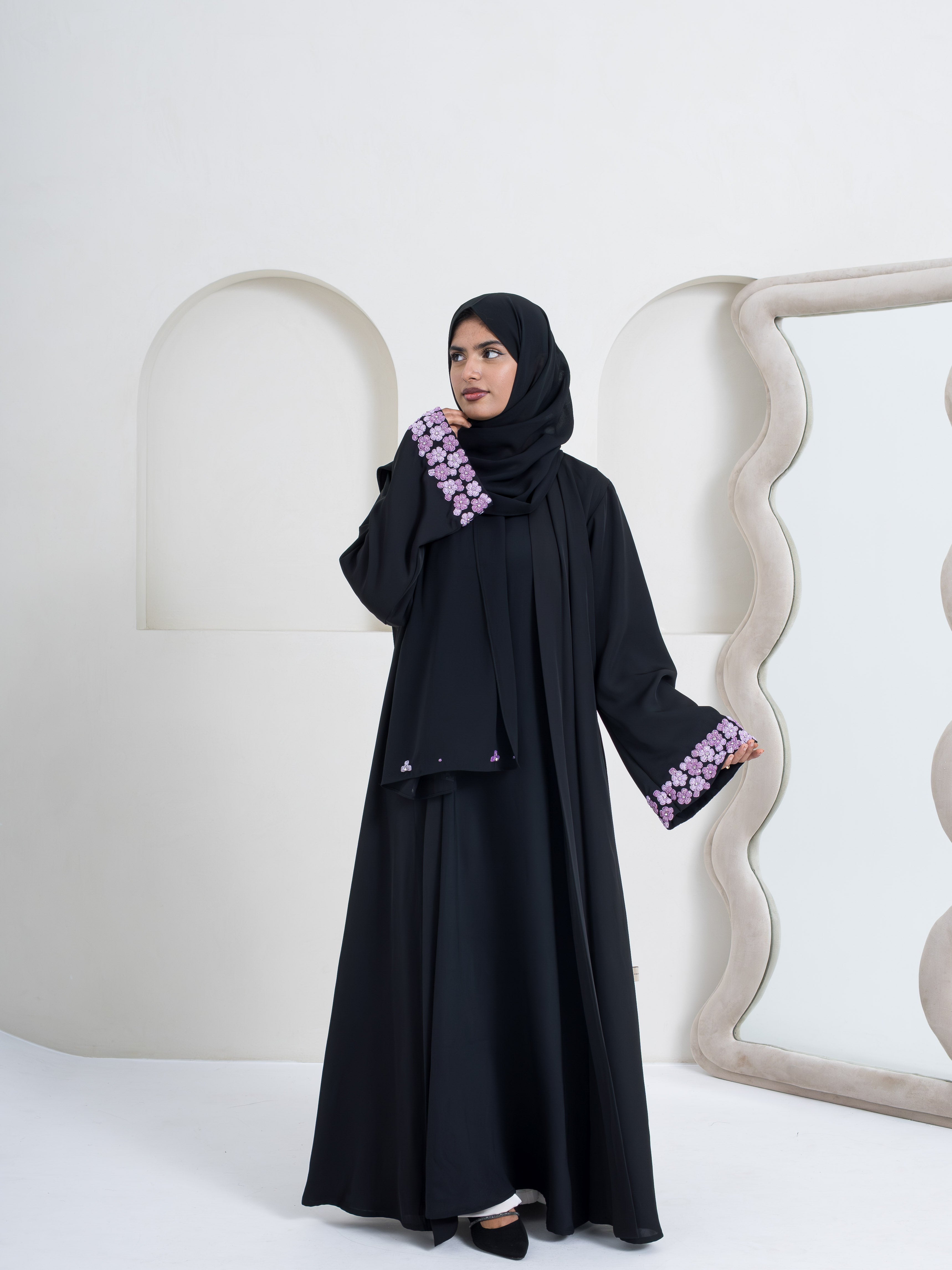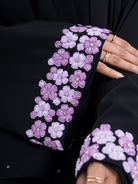 Gracefully detailed with delicate purple floral embroidery, this abaya brings a refined charm to your modest wardrobe. Crafted for effortless elegance, it blends comfort with a polished, elevated look.