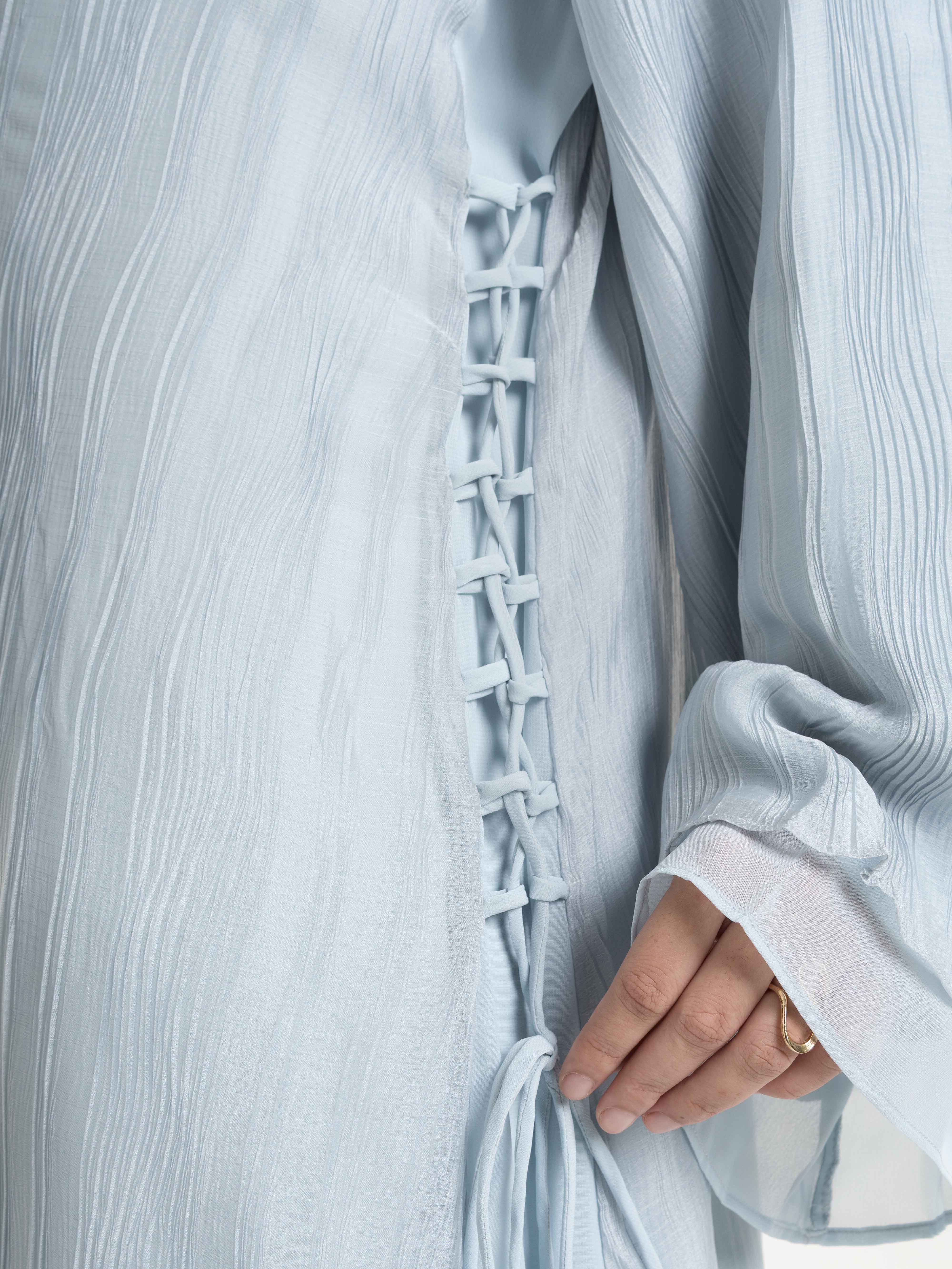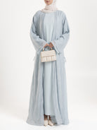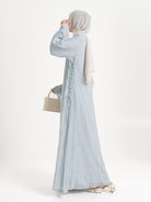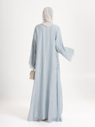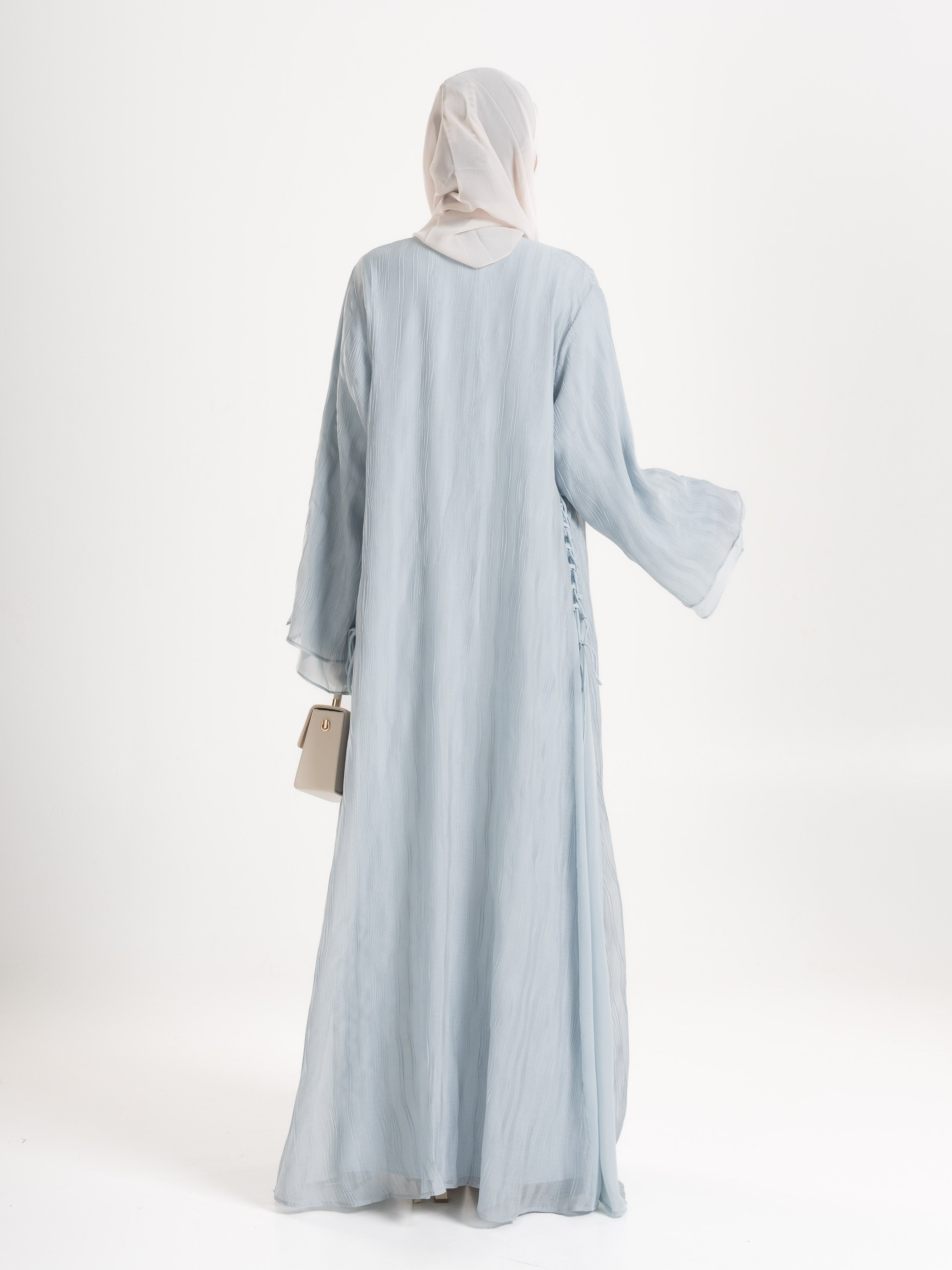 This abaya is a graceful blend of sophistication and ease, crafted to bring elegance into everyday dressing. With its flowing silhouette and delicate crinkled chiffon texture, it offers both comfort and charm. Designed with thoughtful details, it’s perfect for elevated daily wear or formal occasions where subtle femininity shines through.