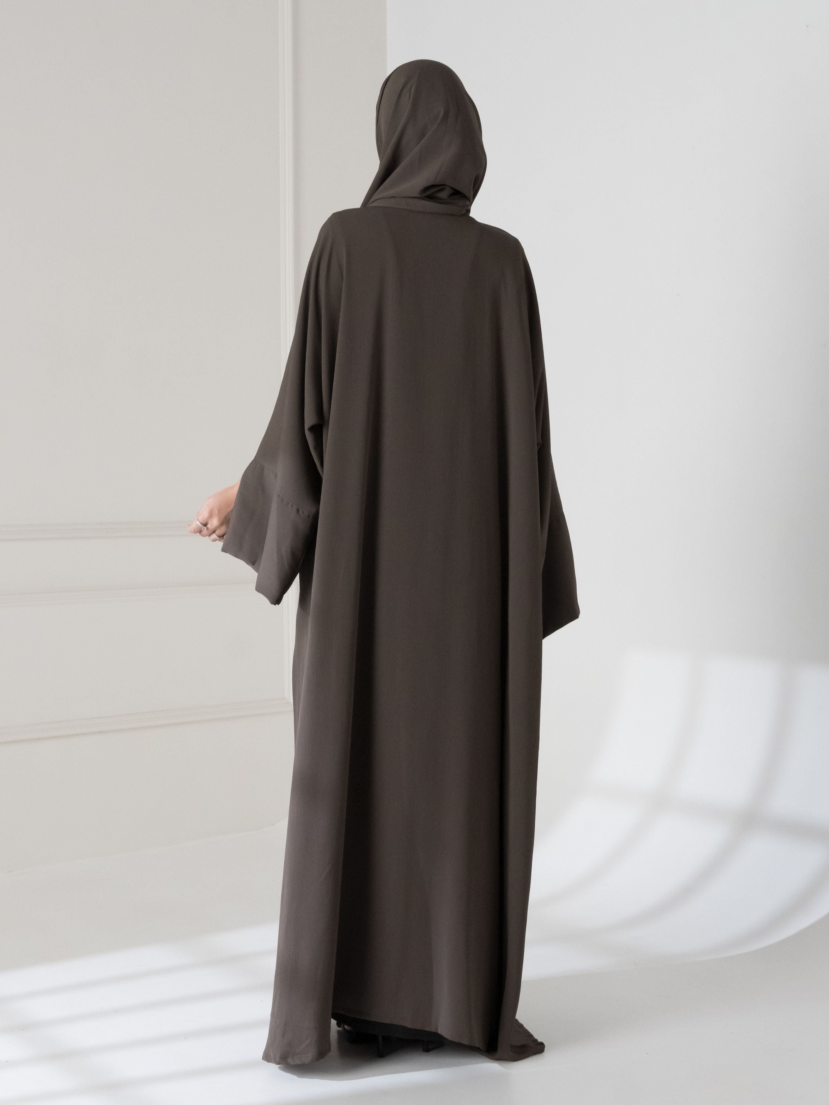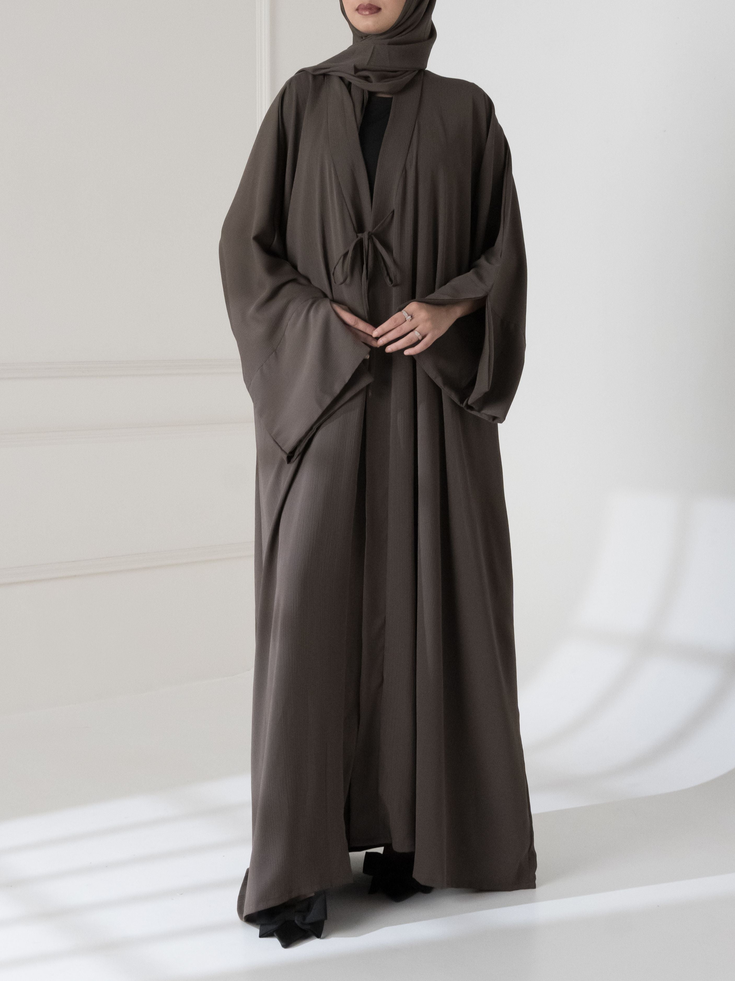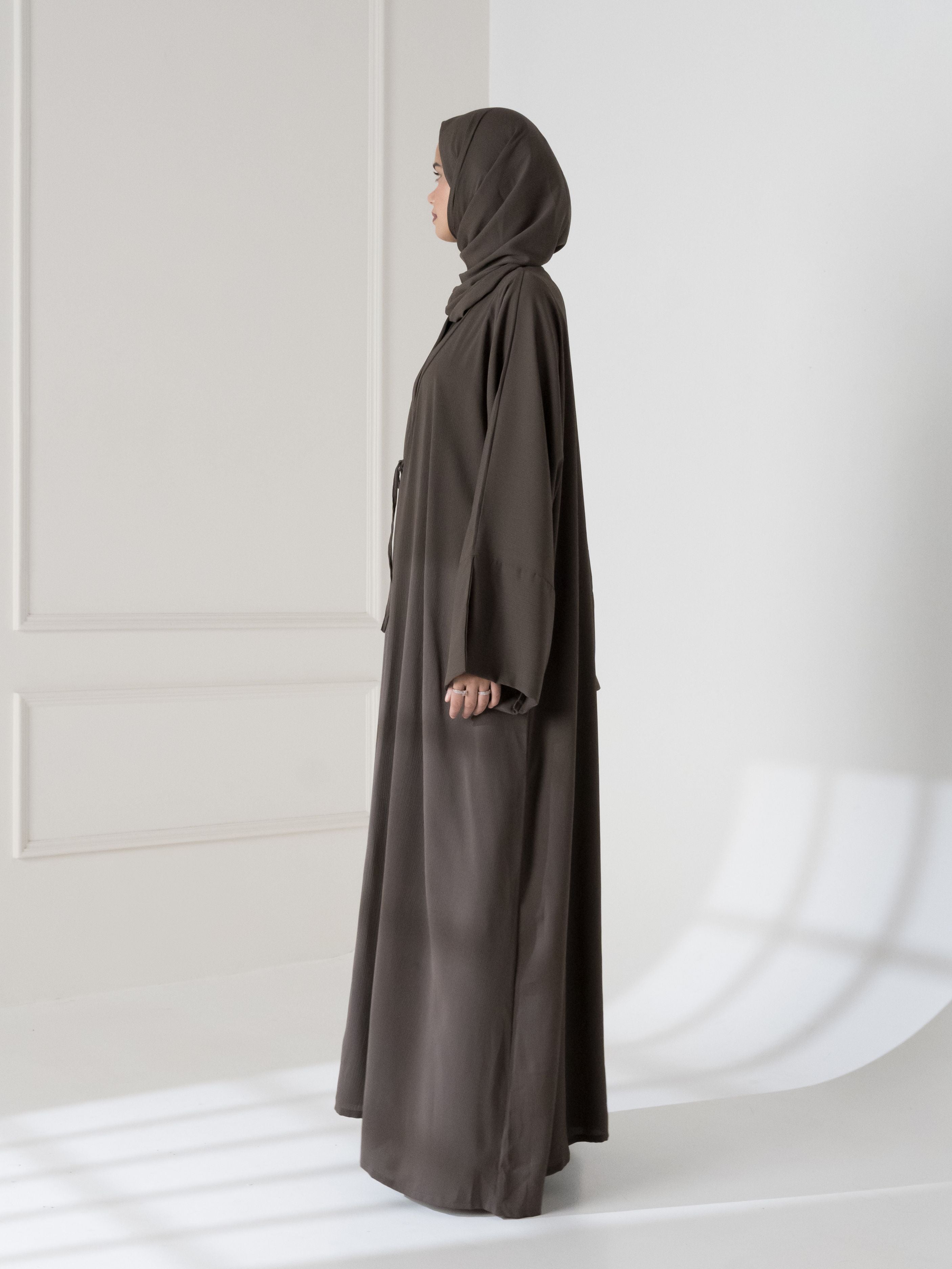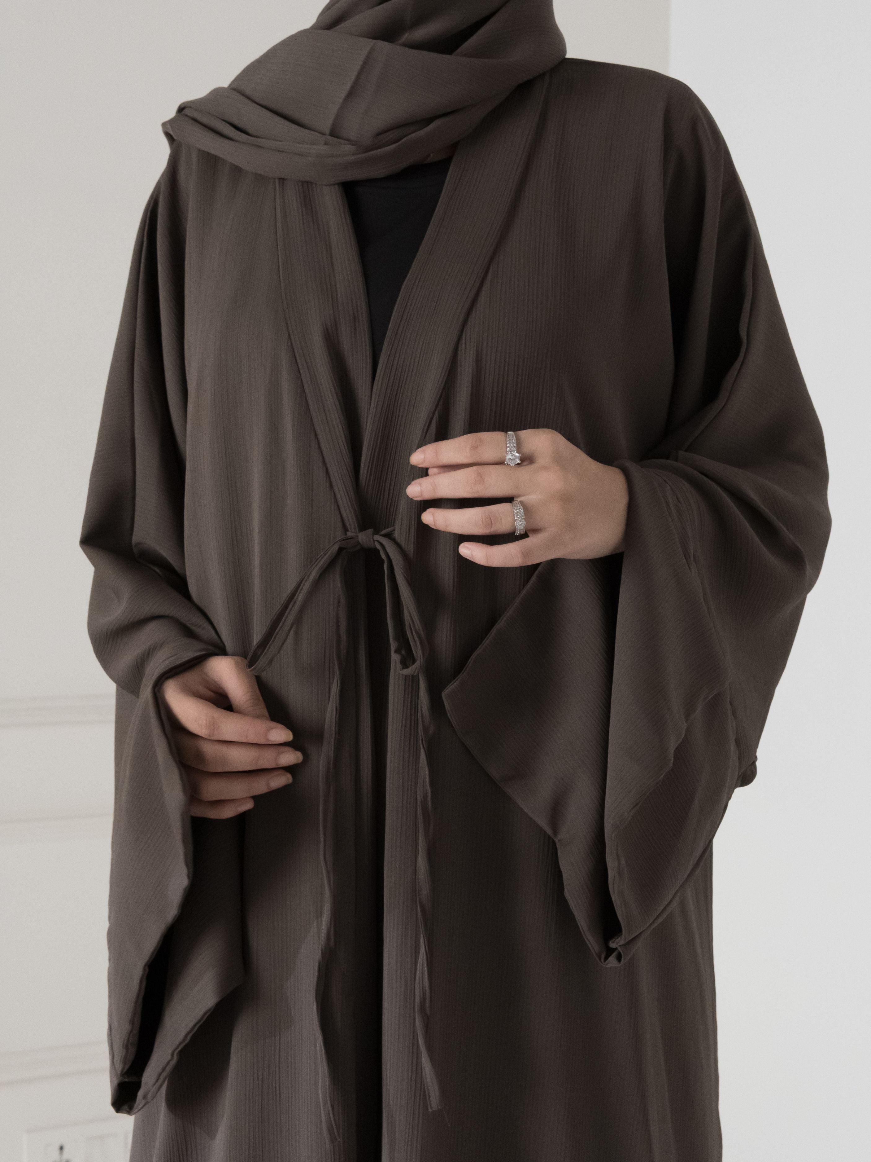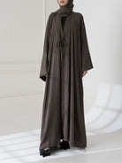 The Iram tie-up abaya is made from elegant crinkled satin fabric and features a tie-up closure in the front. It has a perfect abaya silhouette with slits on the sleeves for a modern touch. This abaya comes with an inner and a matching hijab.