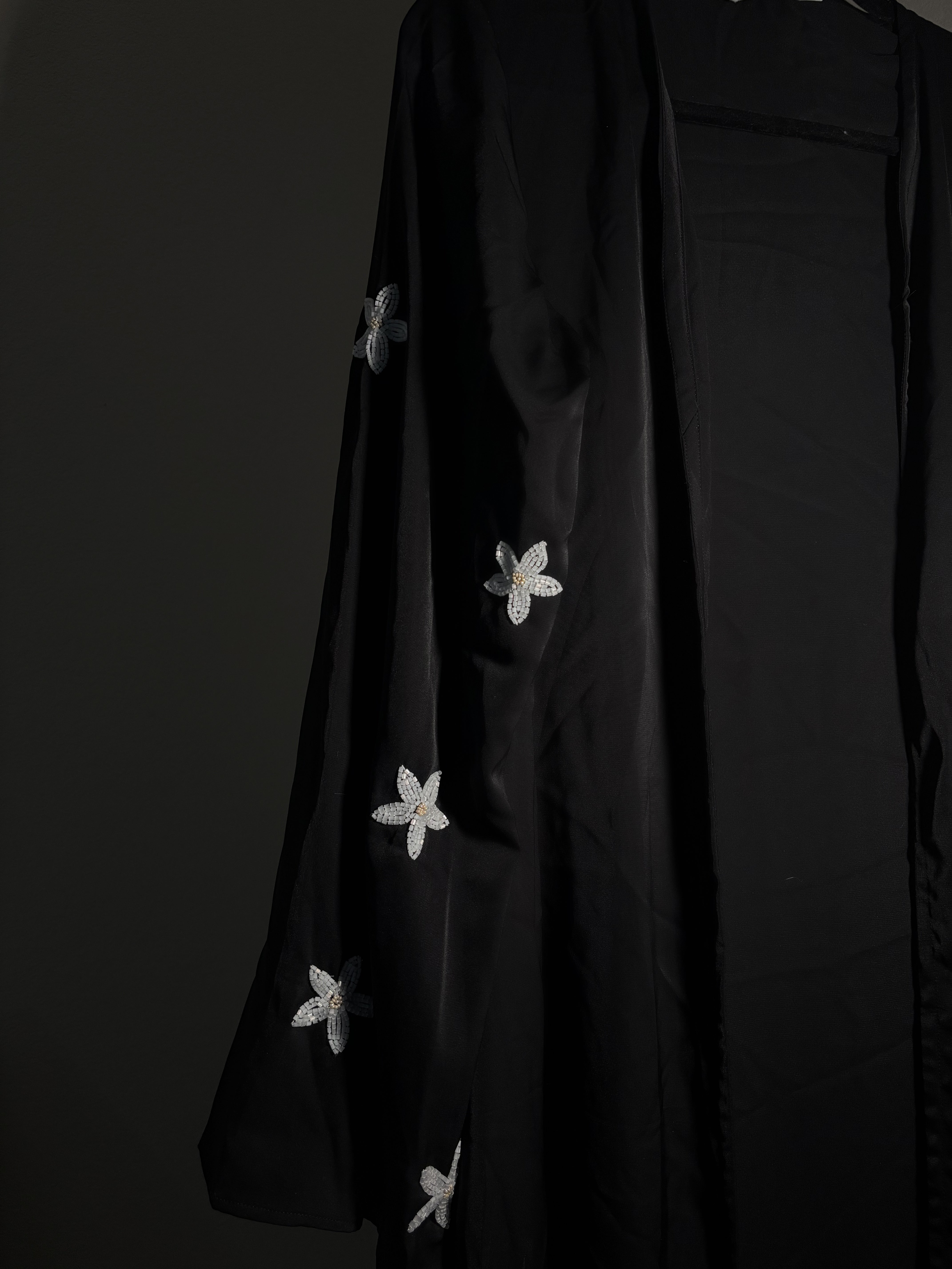Crafted from the finest materials, this abaya features elegant jasmine embroideries flowing gracefully over the sleeves, symbolizing the beloved jasmine flower—Pakistan’s national flower and a timeless emblem of Damascus. Representing purity, resilience, and hope, each stitch carries the story of two nations whose strength and beauty continue to inspire.