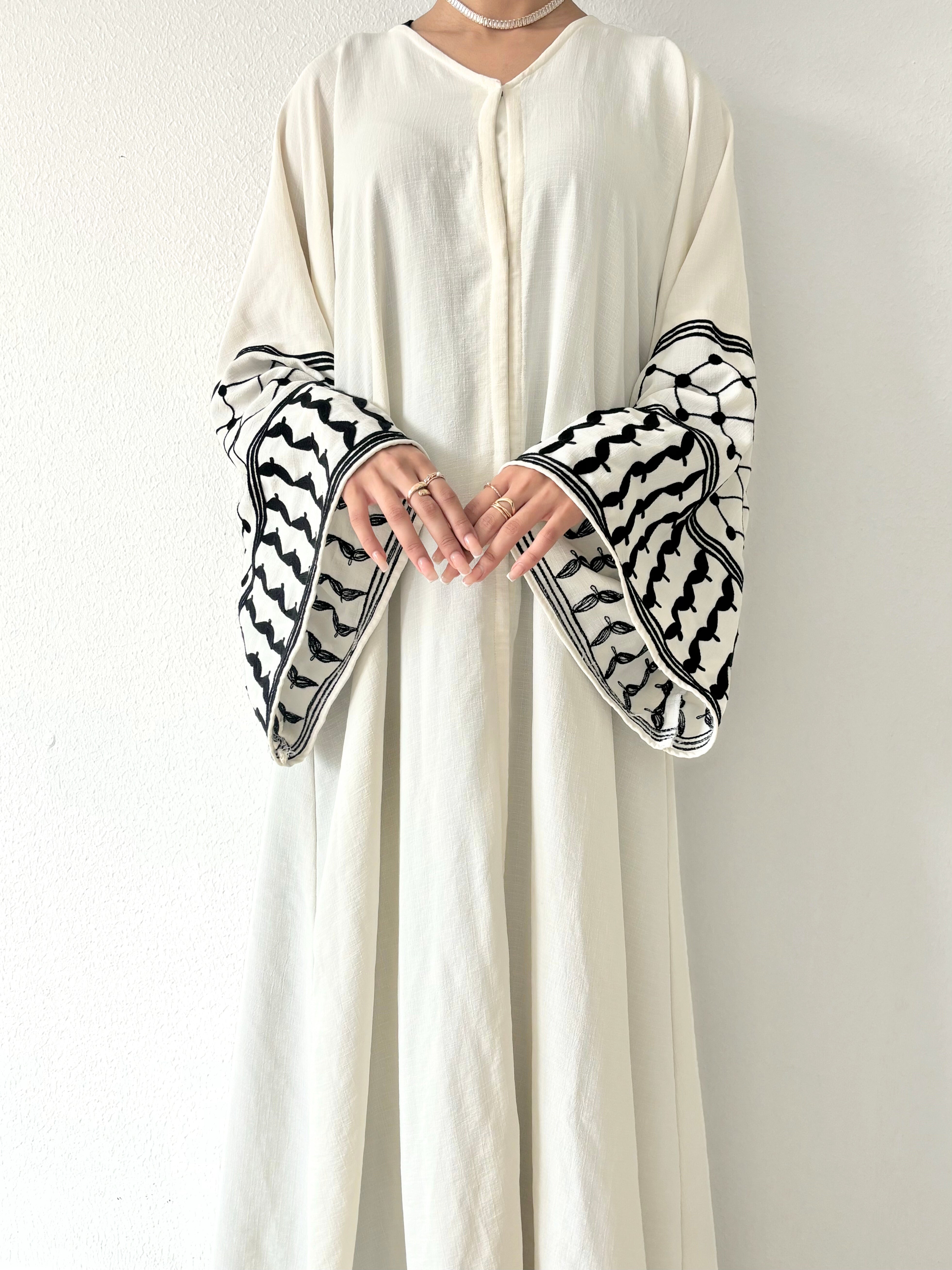 Introducing the Kefiyyeh Abaya White- a stunning masterpiece that combines elegance, comfort, and style. Crafted from high-quality crepe fabric, this abaya is designed to make you feel confident and empowered wherever you go.