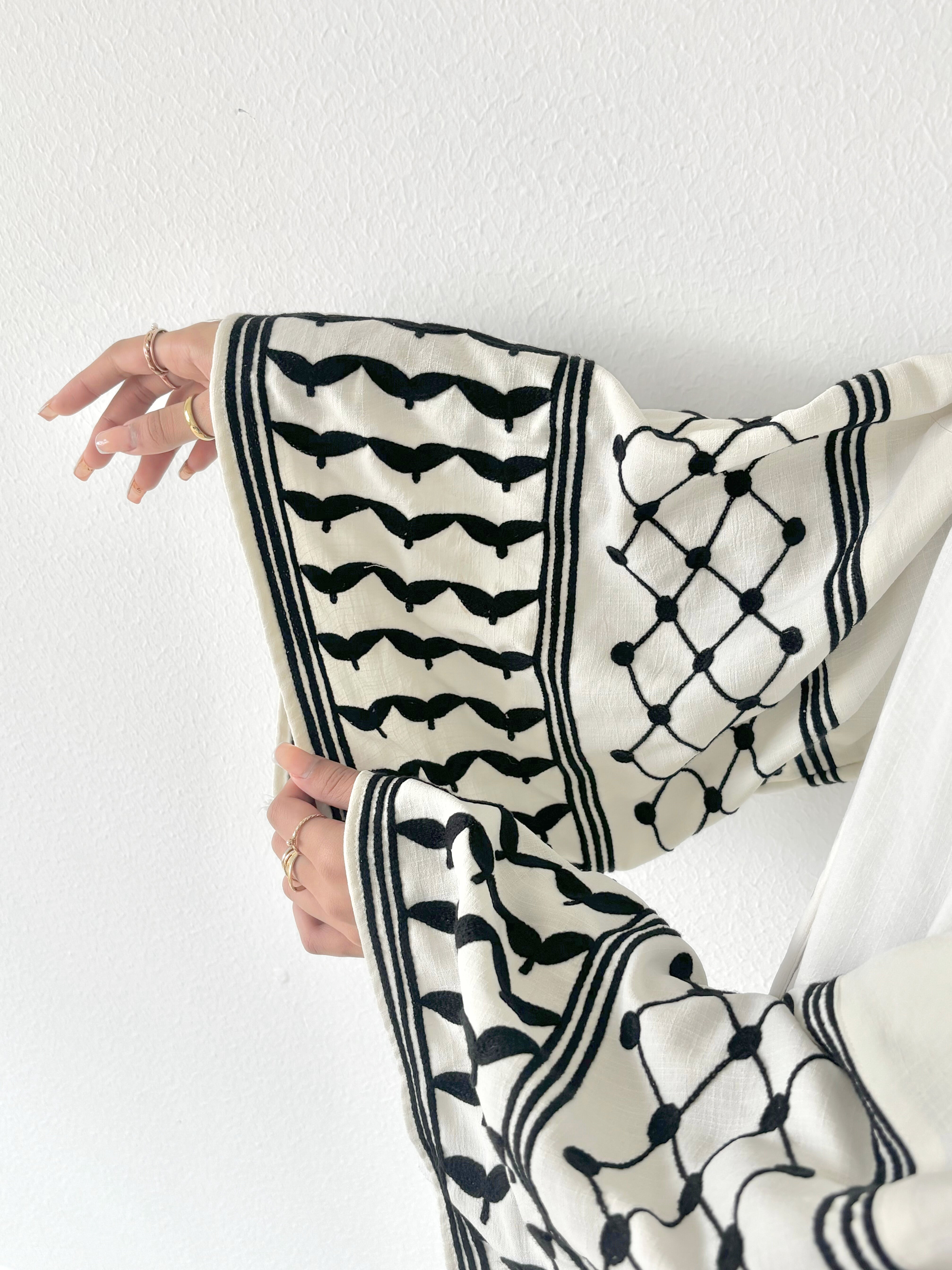 Patterns on the Keffiyeh Abaya sleeves symbolize different aspects of Palestinian life: the bold black stripes on the edges symbolize the historical trade routes that used to go through Palestine; the fishnet-like design represents the Palestinians' ties to the Mediterranean Sea; and the curvy lines resemble olive trees, a major point of pride for Palestinians.