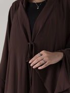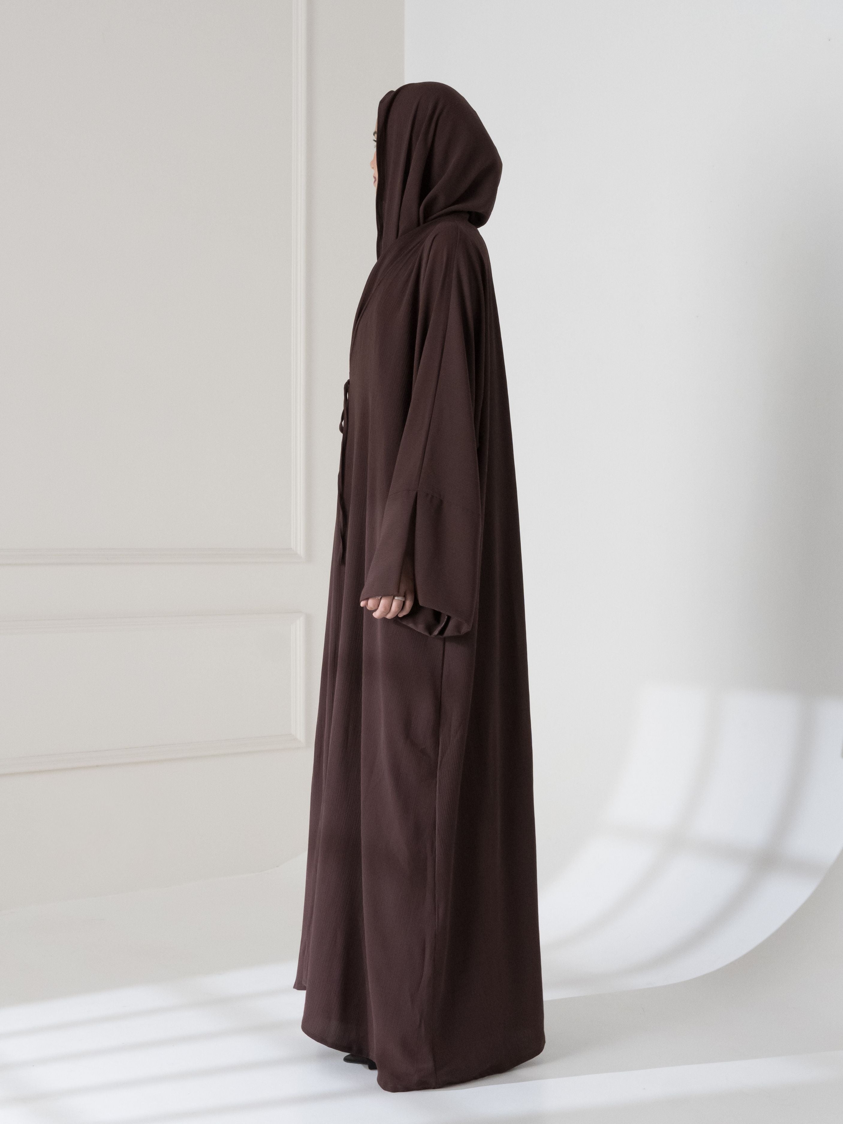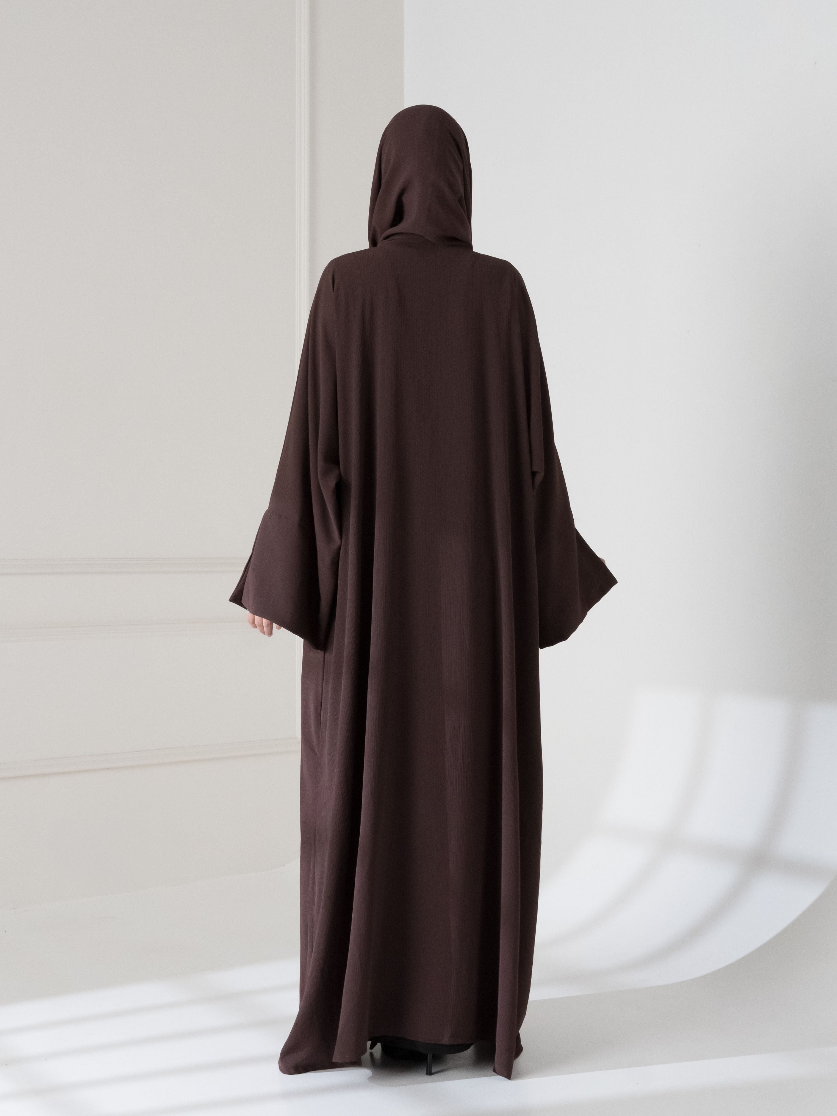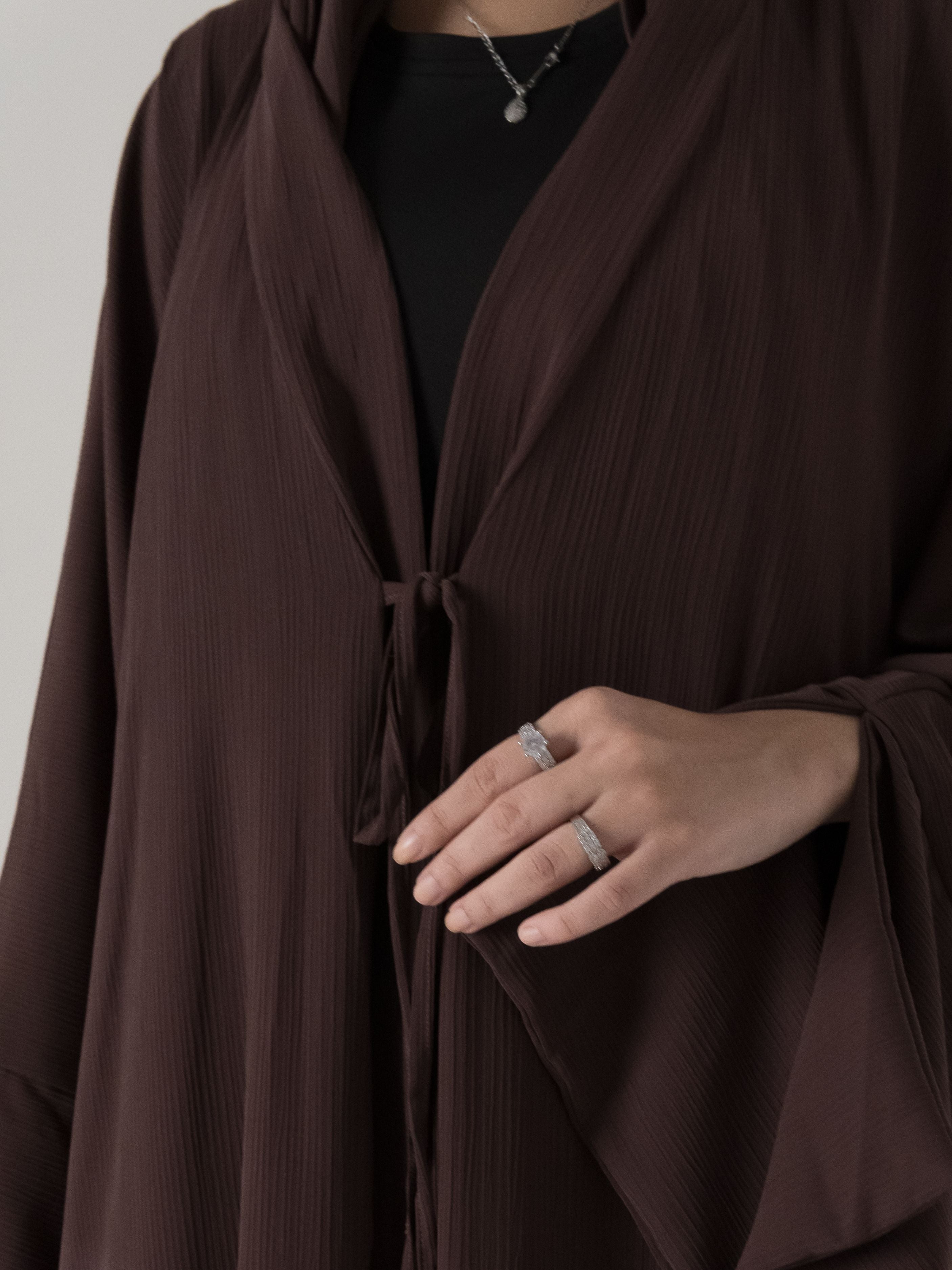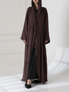 The Iram tie-up abaya is made from elegant crinkled satin fabric and features a tie-up closure in the front. It has a perfect abaya silhouette with slits on the sleeves for a modern touch. This abaya comes with an inner and a matching hijab.