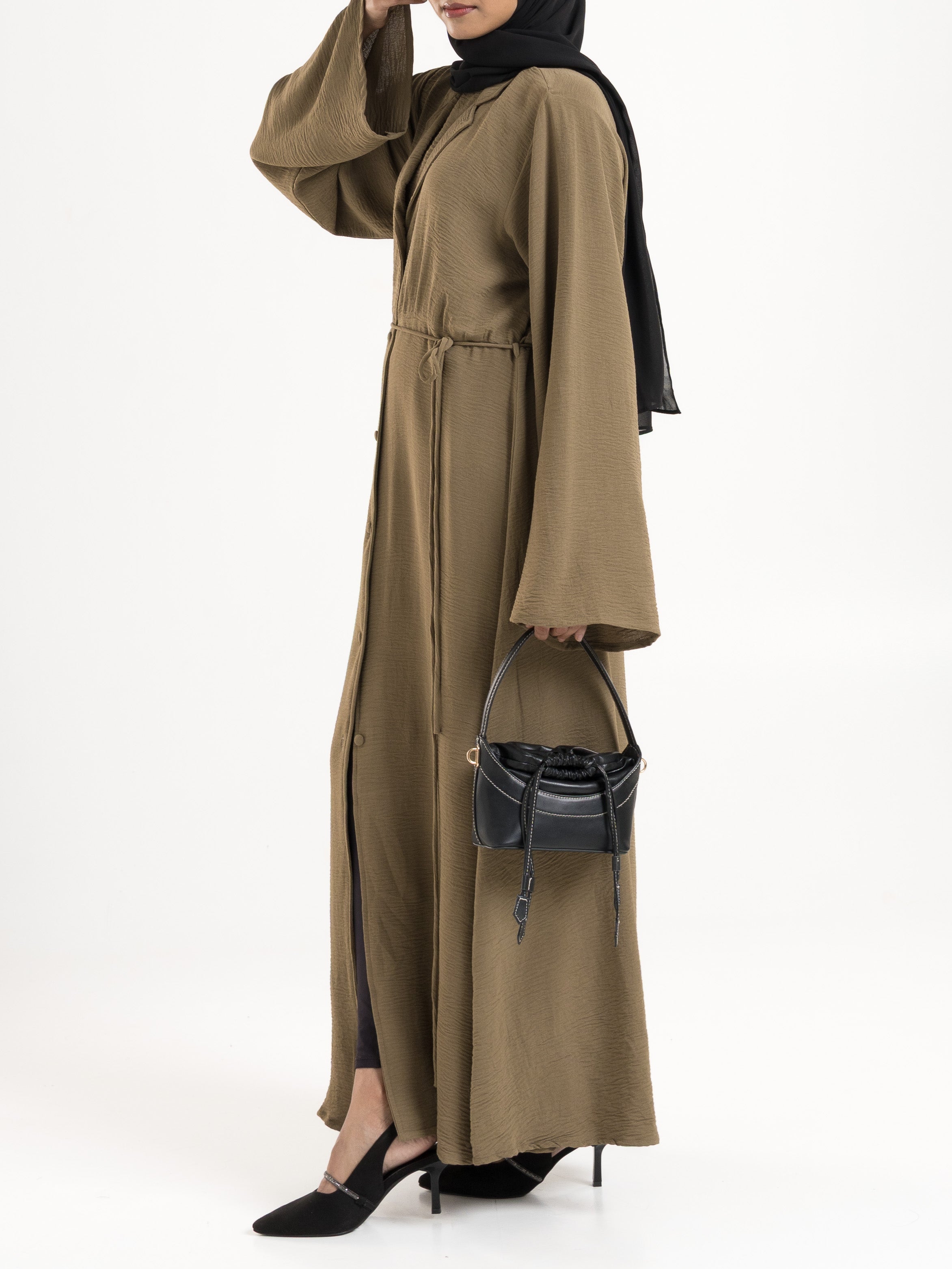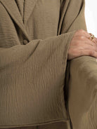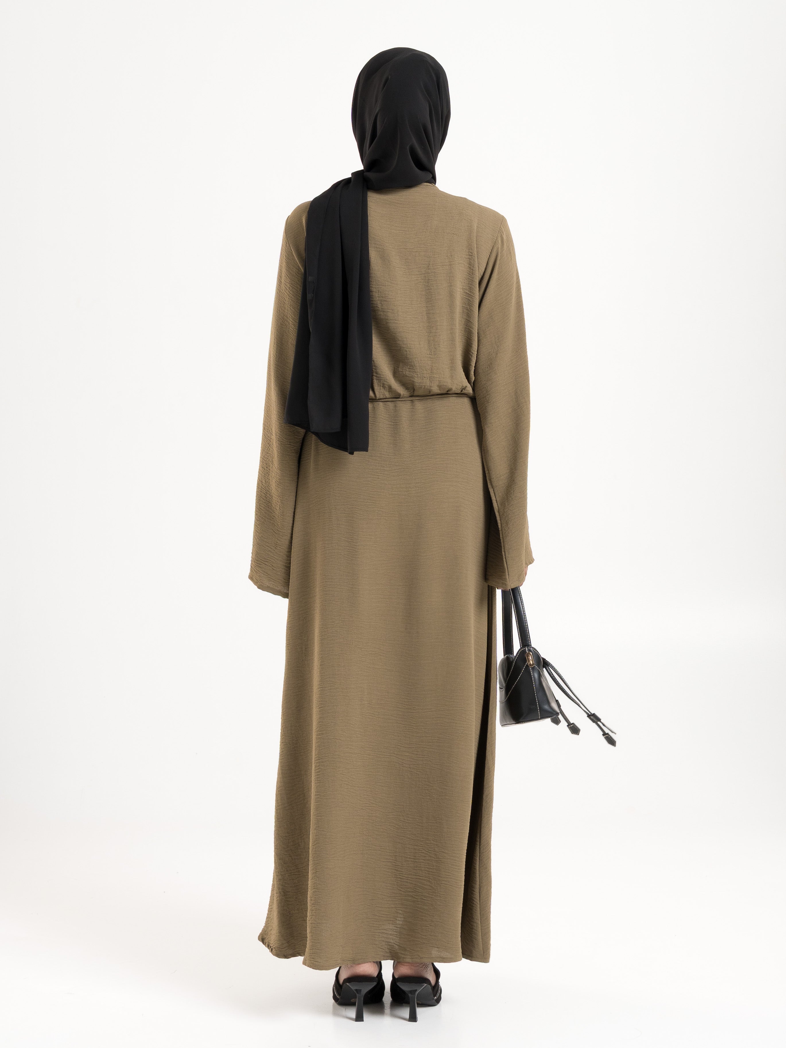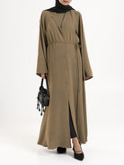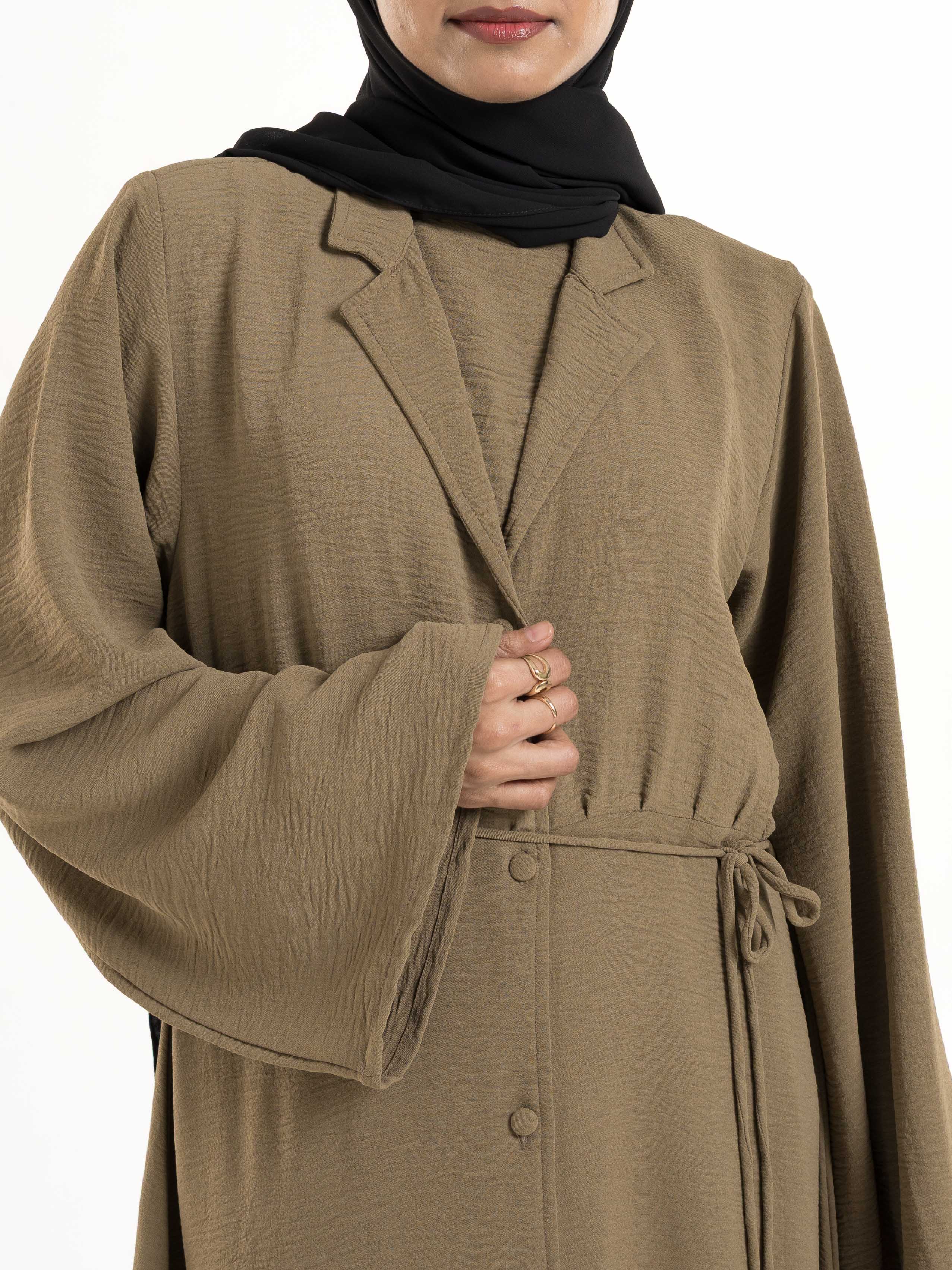 A refined statement piece, this abaya blends contemporary tailoring with timeless modesty. Designed with an attached inner flap and full button-down front, it offers both structure and versatility. The coat-inspired collar and coordinating belt add a polished touch, making it perfect for formal settings or elevated everyday wear.