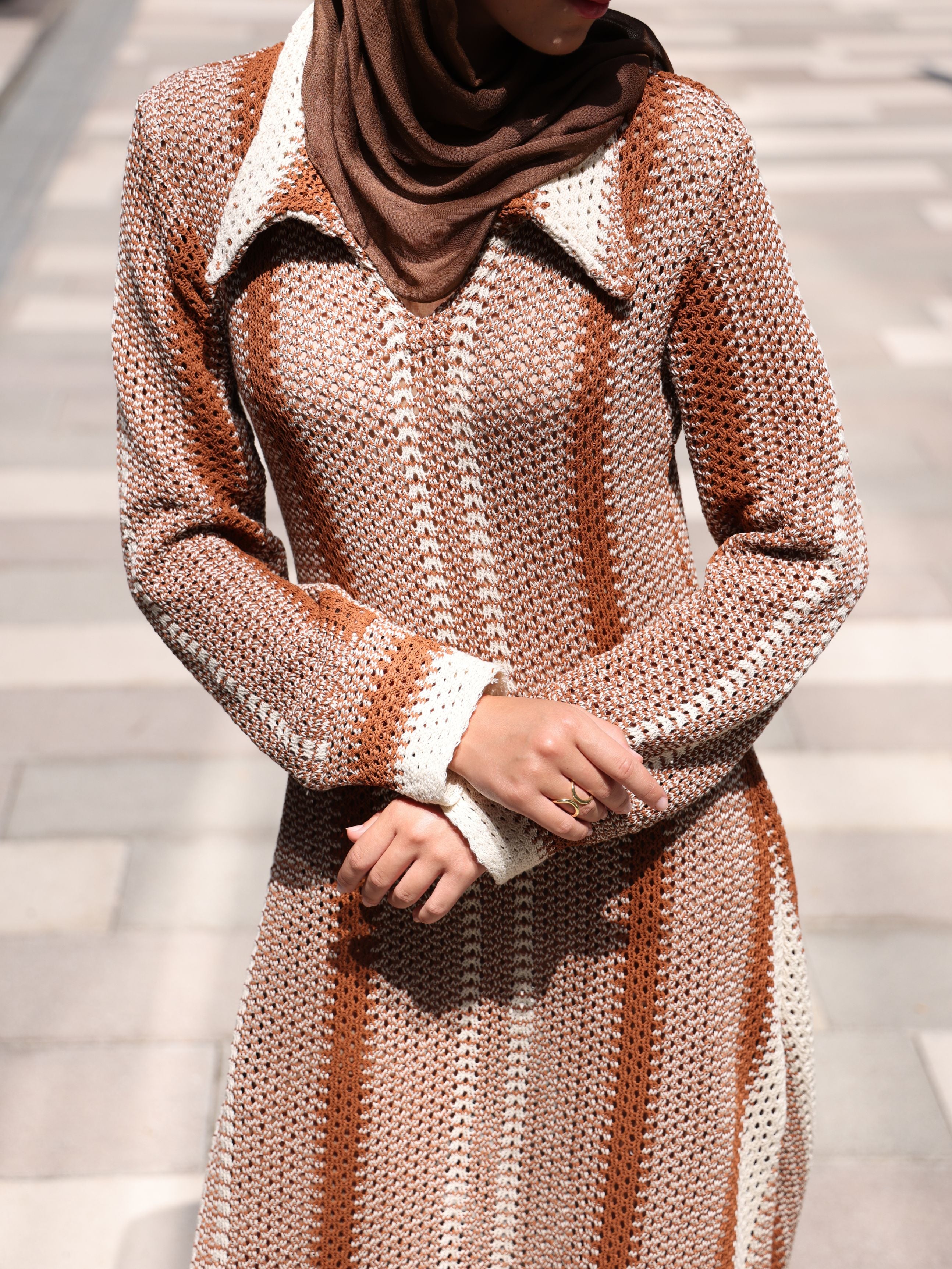 Elevate your wardrobe with our stunning knitted dress, featuring contrasting tones of brown and beige that perfectly capture the essence of the season. Crafted from 100% cotton knit, this dress ensures ultimate comfort and style. The elegant collar detail and color block design add a sophisticated touch.