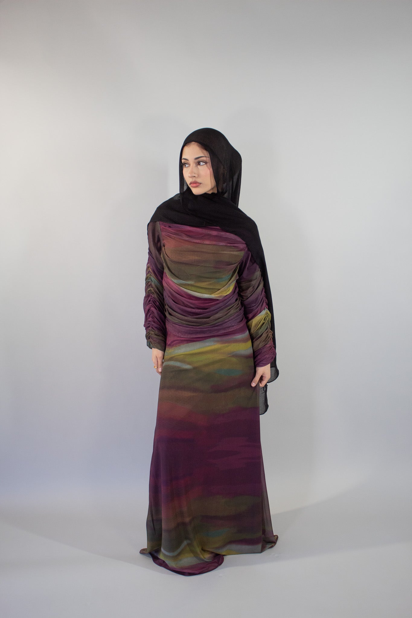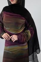 The soft mesh layer flows gracefully, while the fitted inner provides comfortable coverage, making it the perfect balance between modesty and modern sophistication. Ideal for Ramadan nights, Eid gatherings, and formal occasions, this dress embodies understated luxury.