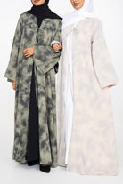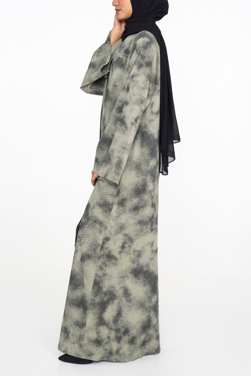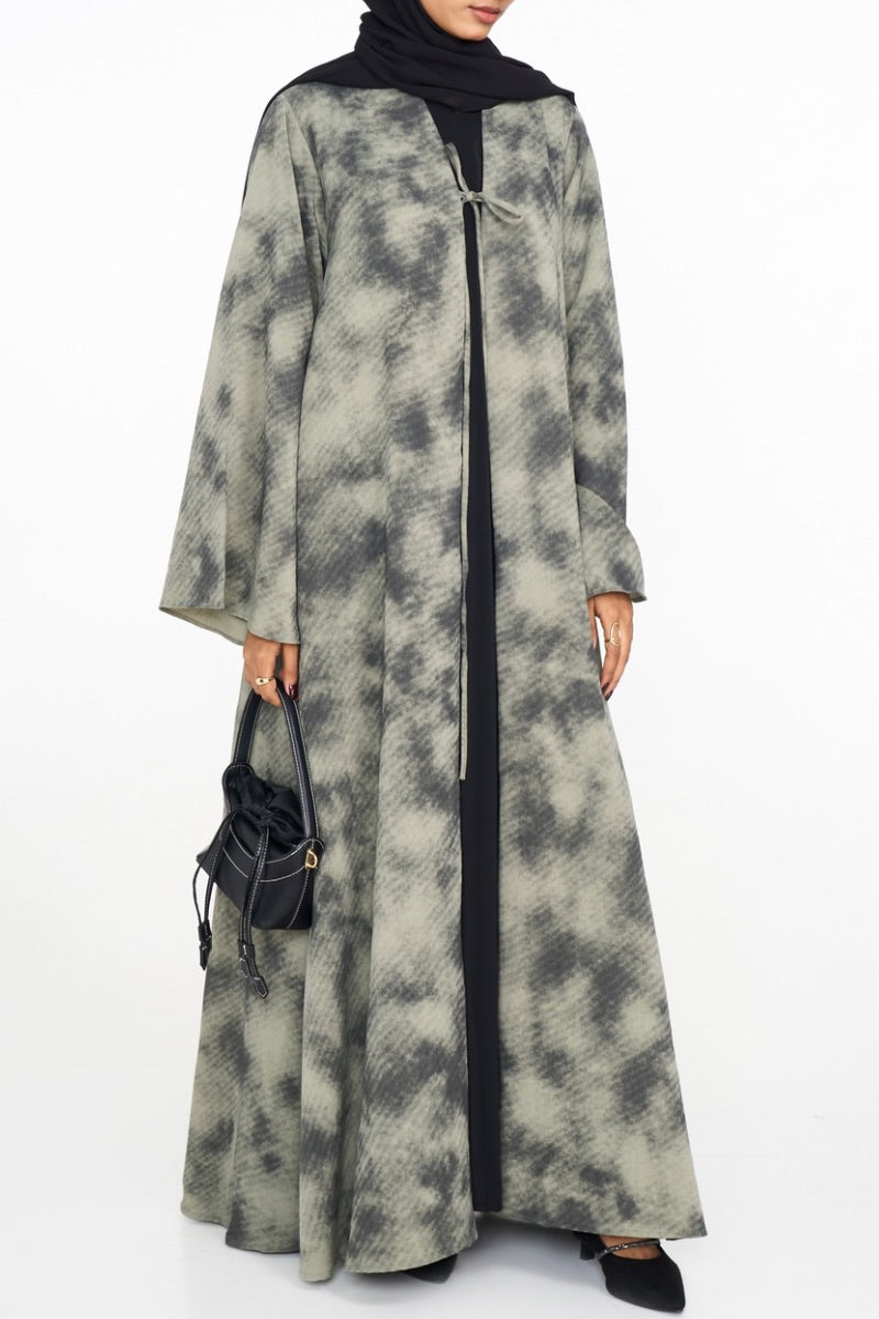 – Printed open abaya with a soft A-line silhouette