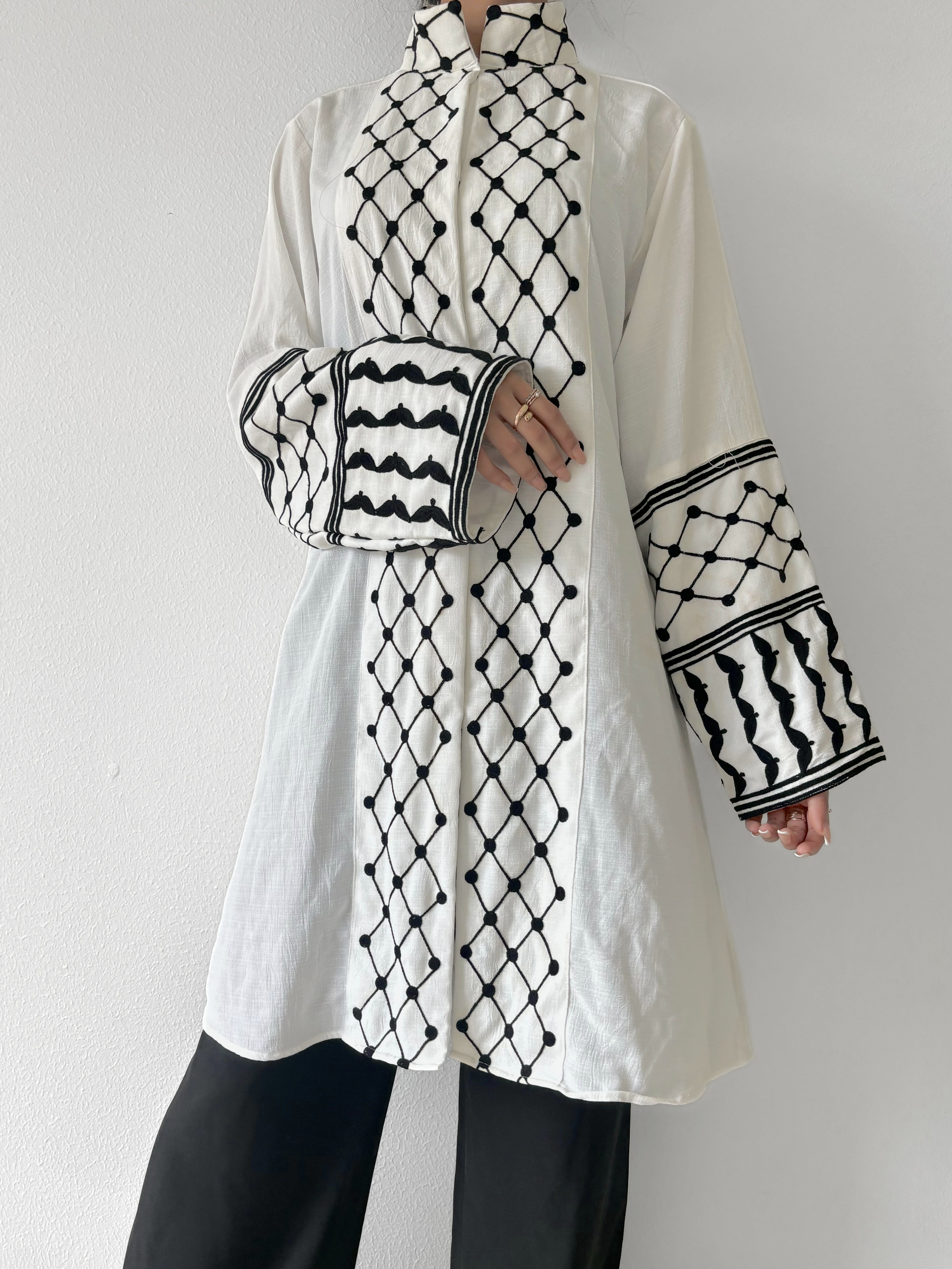 Introducing our stunning Kefiyyeh inspired Jacket - White the epitome of style, culture, and elegance! Crafted with intricate kefiyyeh embroidery, this jacket seamlessly combines tradition and modern design. The high neck adds a touch of sophistication, while the buttons provide a secure and stylish closure. Step out in confidence, turning heads wherever you go, with this unique and fashionable statement piece. Embrace the fusion of heritage and contemporary fashion with our Kefiyyeh inspired Jacket today!