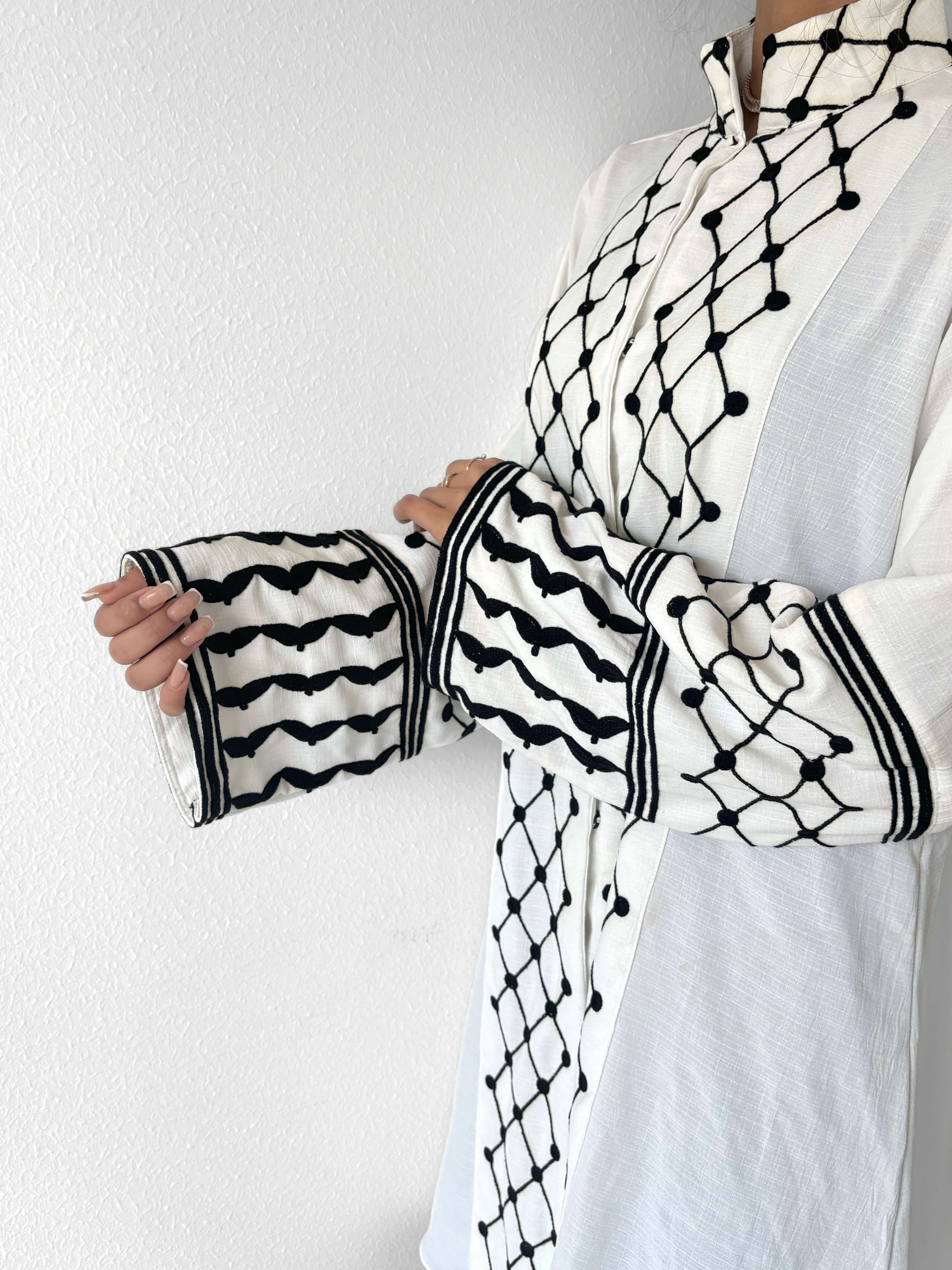 Patterns on the Keffiyeh Abaya sleeves symbolize different aspects of Palestinian life: the bold black stripes on the edges symbolize the historical trade routes that used to go through Palestine; the fishnet-like design represents the Palestinians' ties to the Mediterranean Sea; and the curvy lines resemble olive trees, a major point of pride for Palestinians.