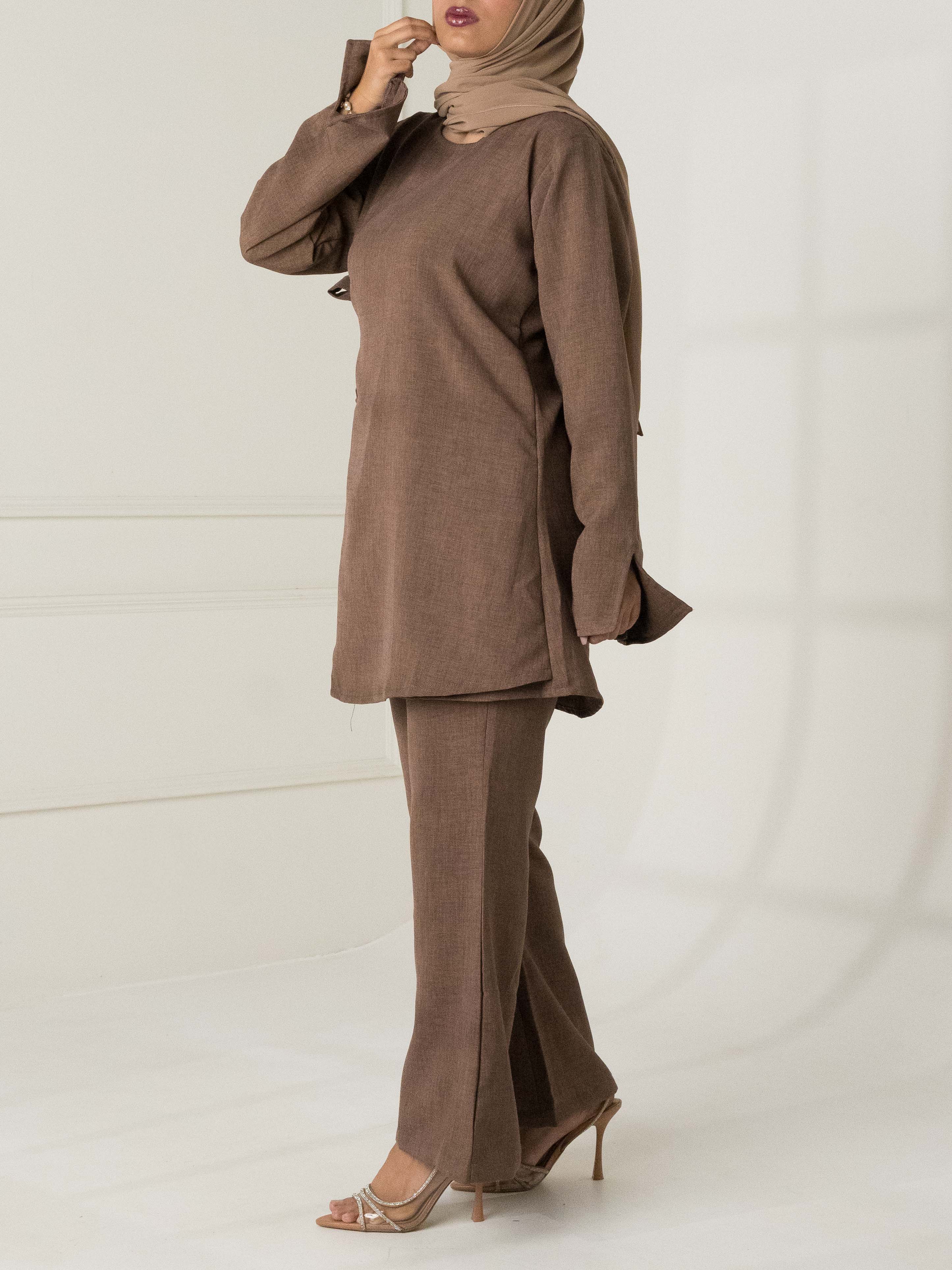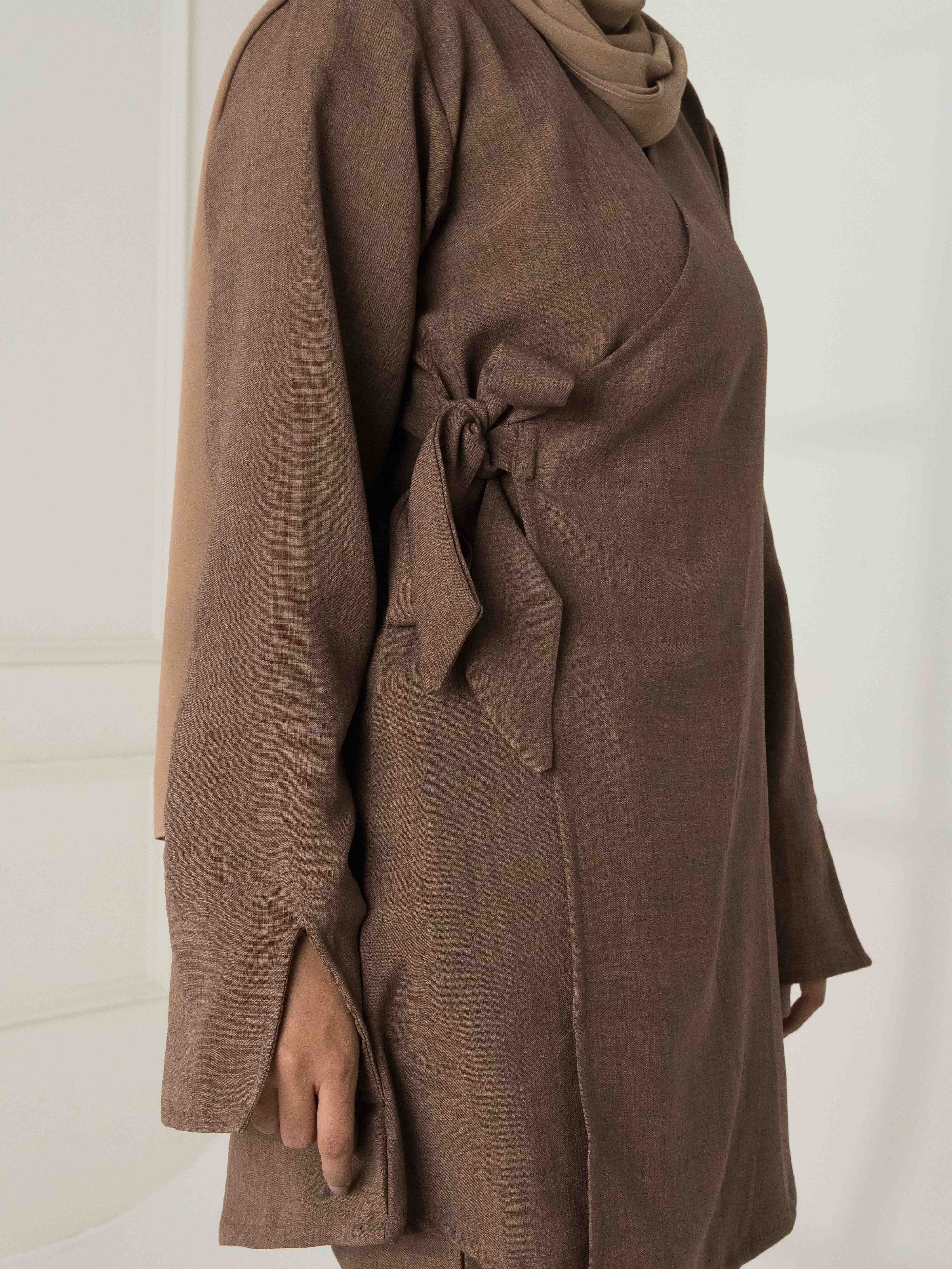 The Maha Wrap Co-Ord Set in Brown is the ultimate combination of elegance and comfort, making it a must-have addition to your wardrobe. This chic two-piece set features a wrap-style top with a flattering, adjustable tie closure, ensuring a customizable fit that flatters your figure while maintaining a modest silhouette. Whether you're dressing for a brunch outfit or a polished event, this wrap co-ord set offers effortless style and versatility. Embrace sophistication with this must-have co-ord set.