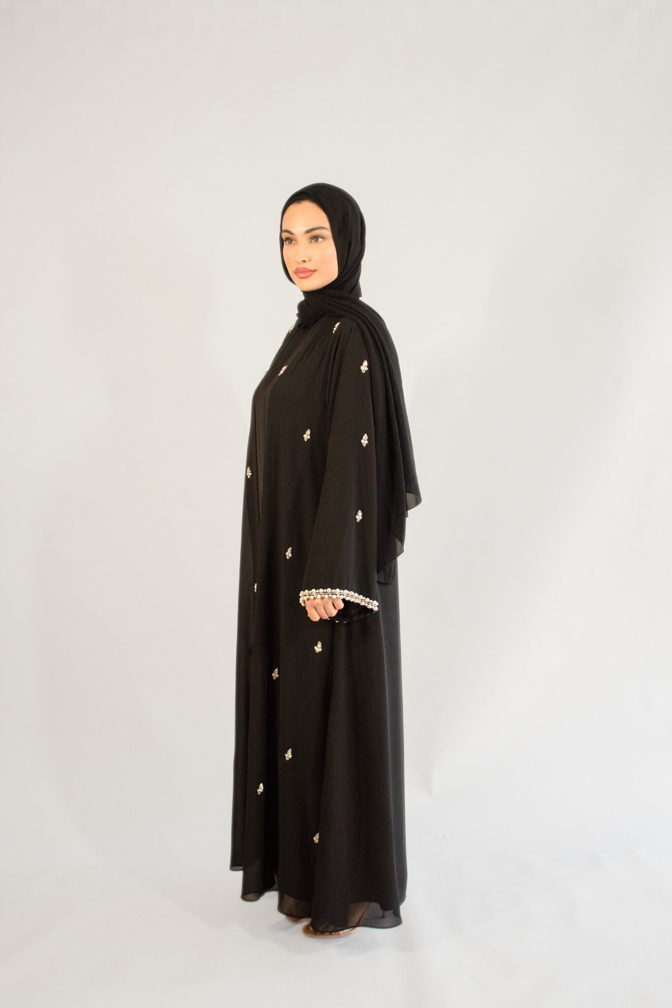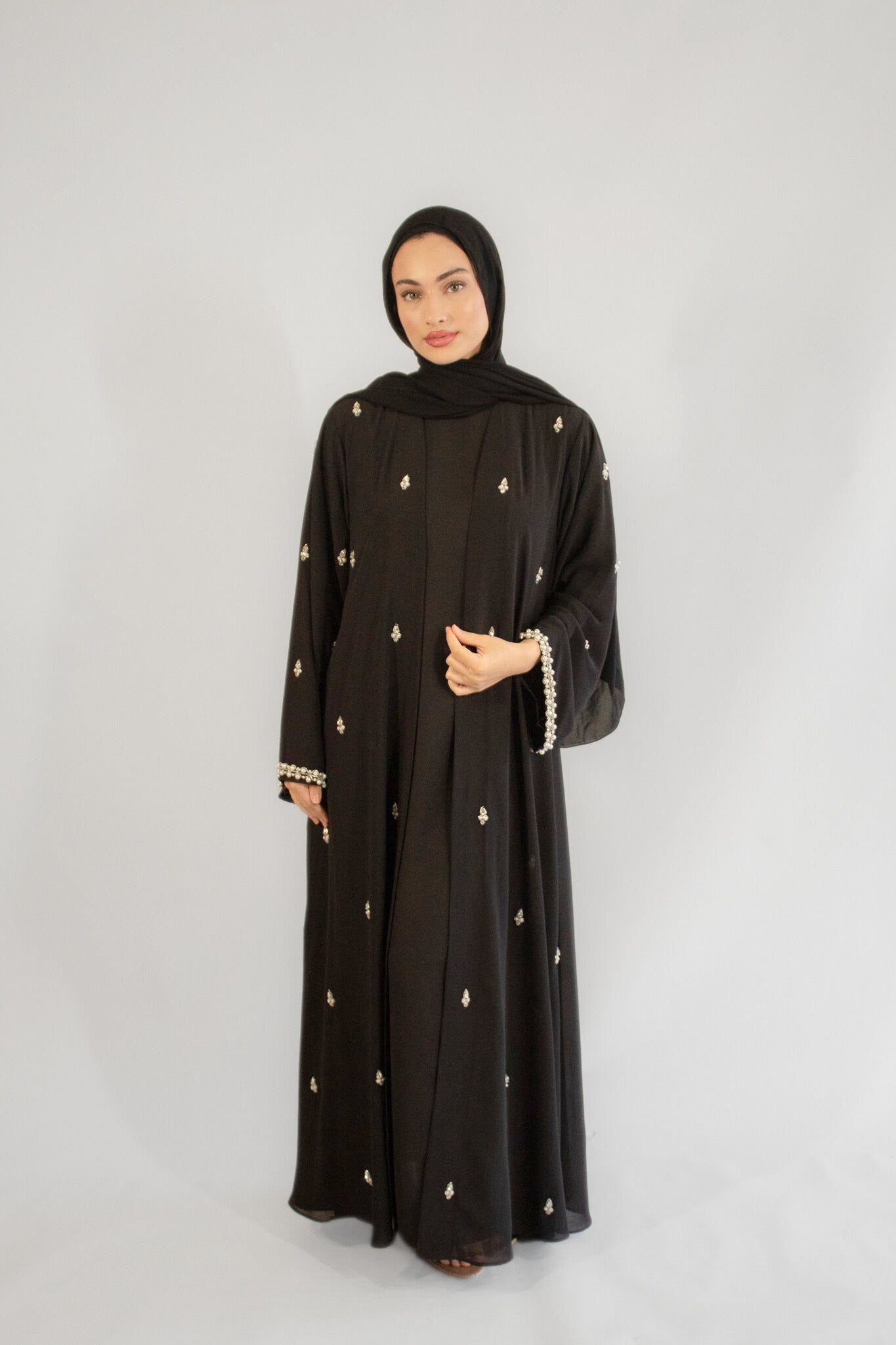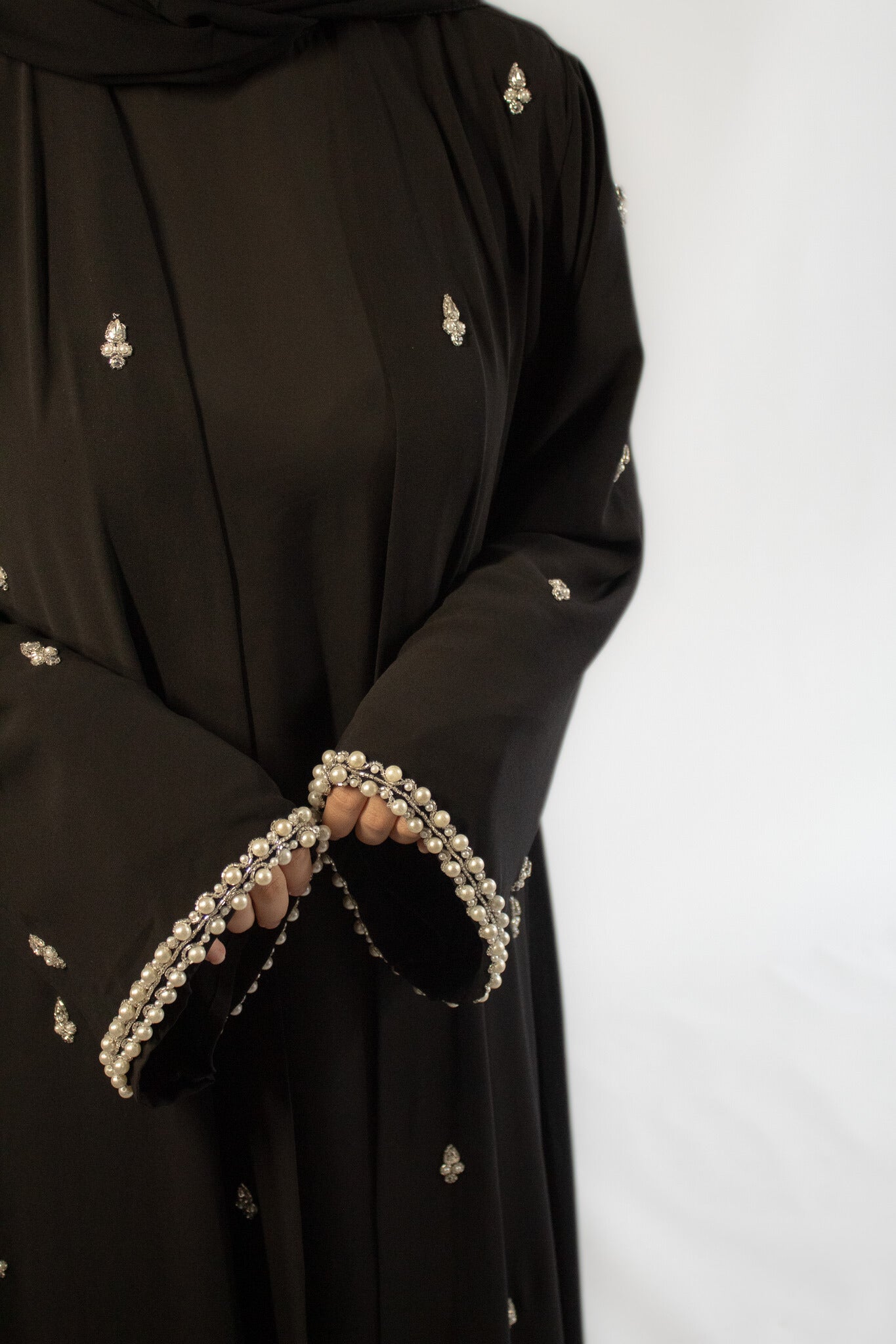 Delicately adorned with crystal and pearl embellishments, this abaya offers a subtle sparkle that catches the light beautifully — perfect for the blessed nights of Ramadan and Eid celebrations.