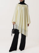 Elevate your wardrobe with our asymmetric layered chiffon top — a flowy, modest essential designed for effortless elegance. Featuring a gathered neckline, airy silhouette, and full sleeves with elasticated cuffs, this versatile piece comes with an inner for comfortable coverage, making it perfect for both everyday wear and special occasions.