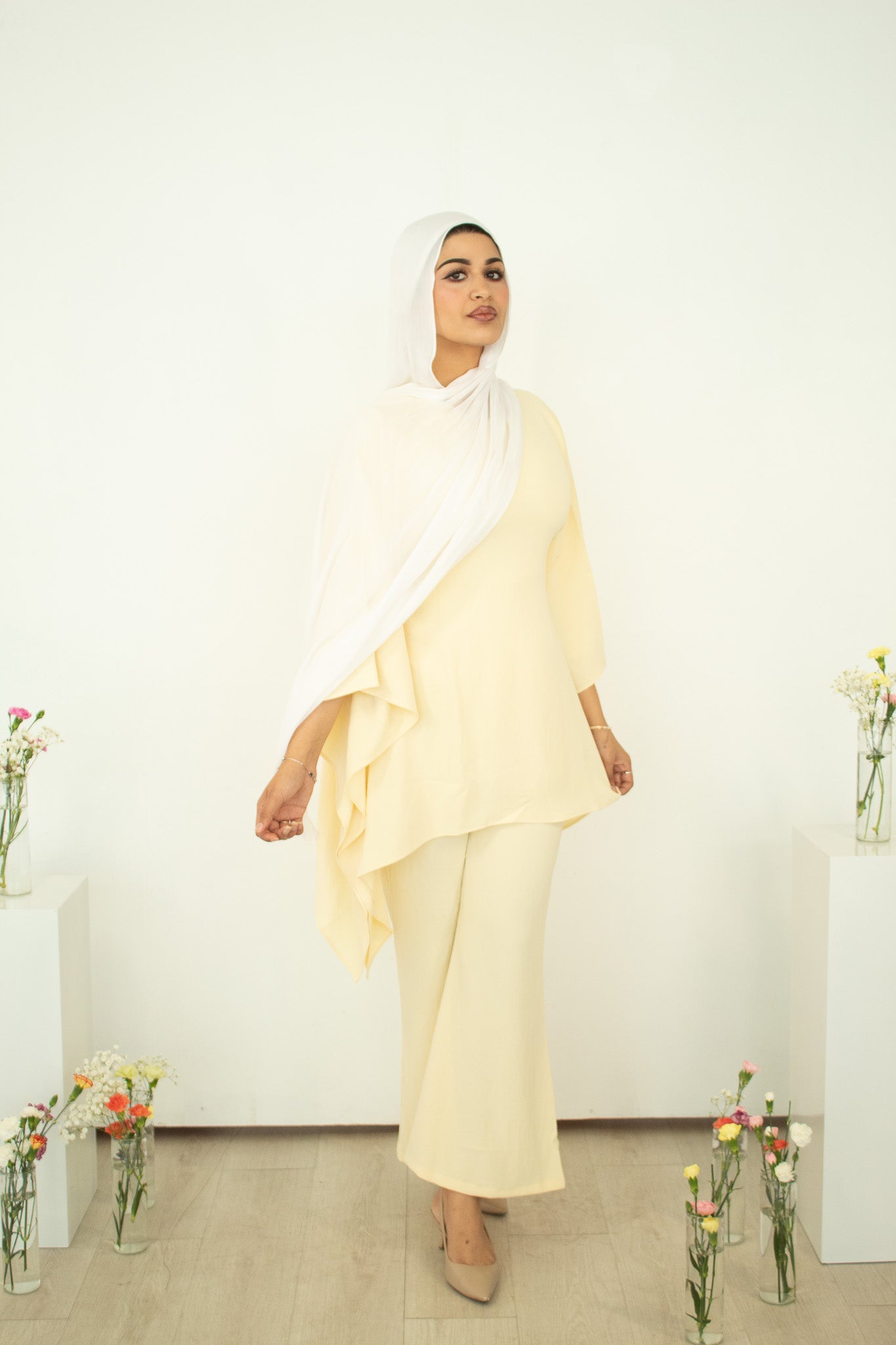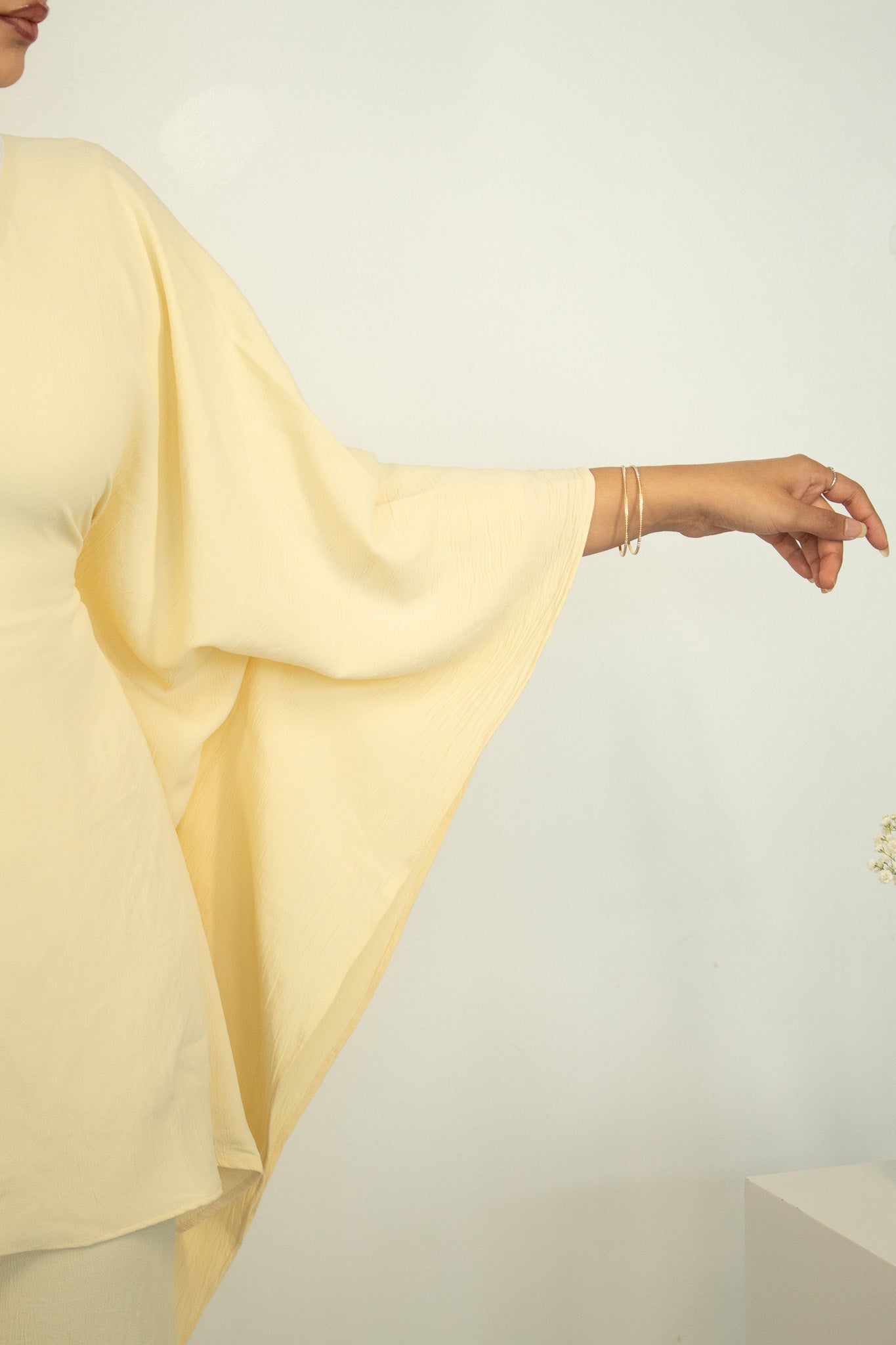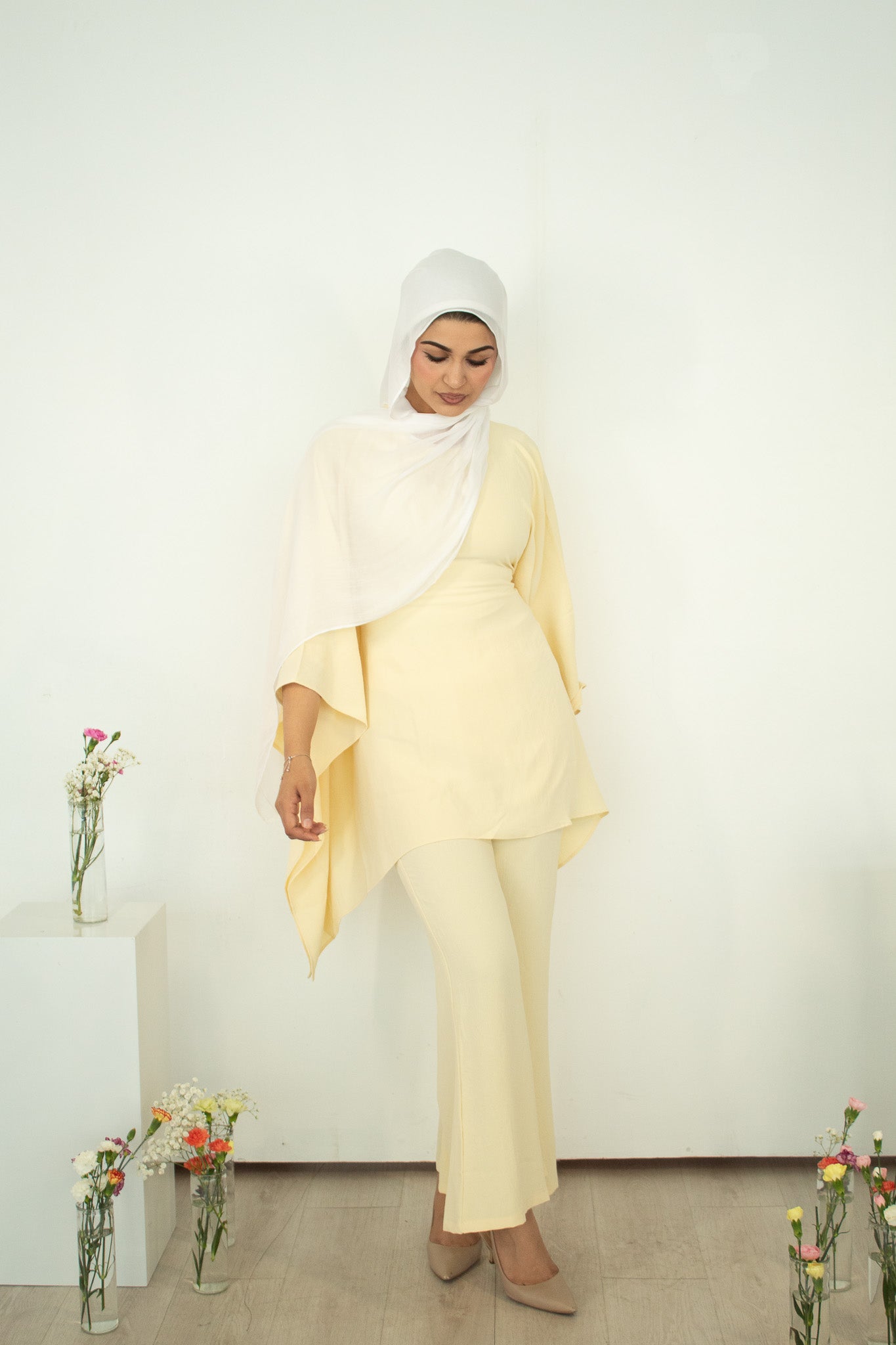 A graceful blend of comfort and sophistication — the Farasha Two Piece Set is a modern essential with a butterfly-inspired silhouette. Designed in a soft, flowy fabric, the set balances elegance with ease. The top features a flattering adjustable fit with an inner tie and back zipper, while the wide-leg pants create effortless movement with every step. A versatile look for occasions, gatherings, or elevated everyday wear.