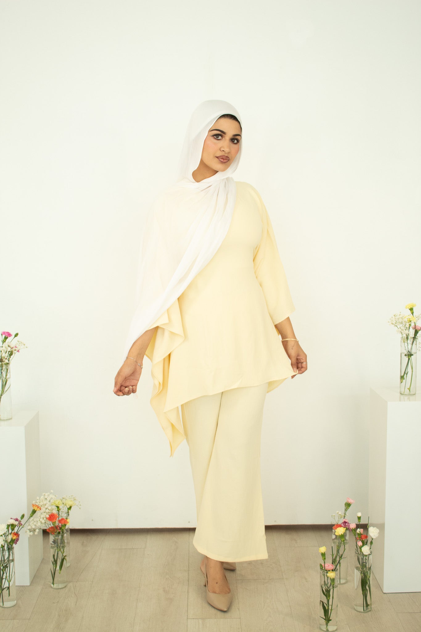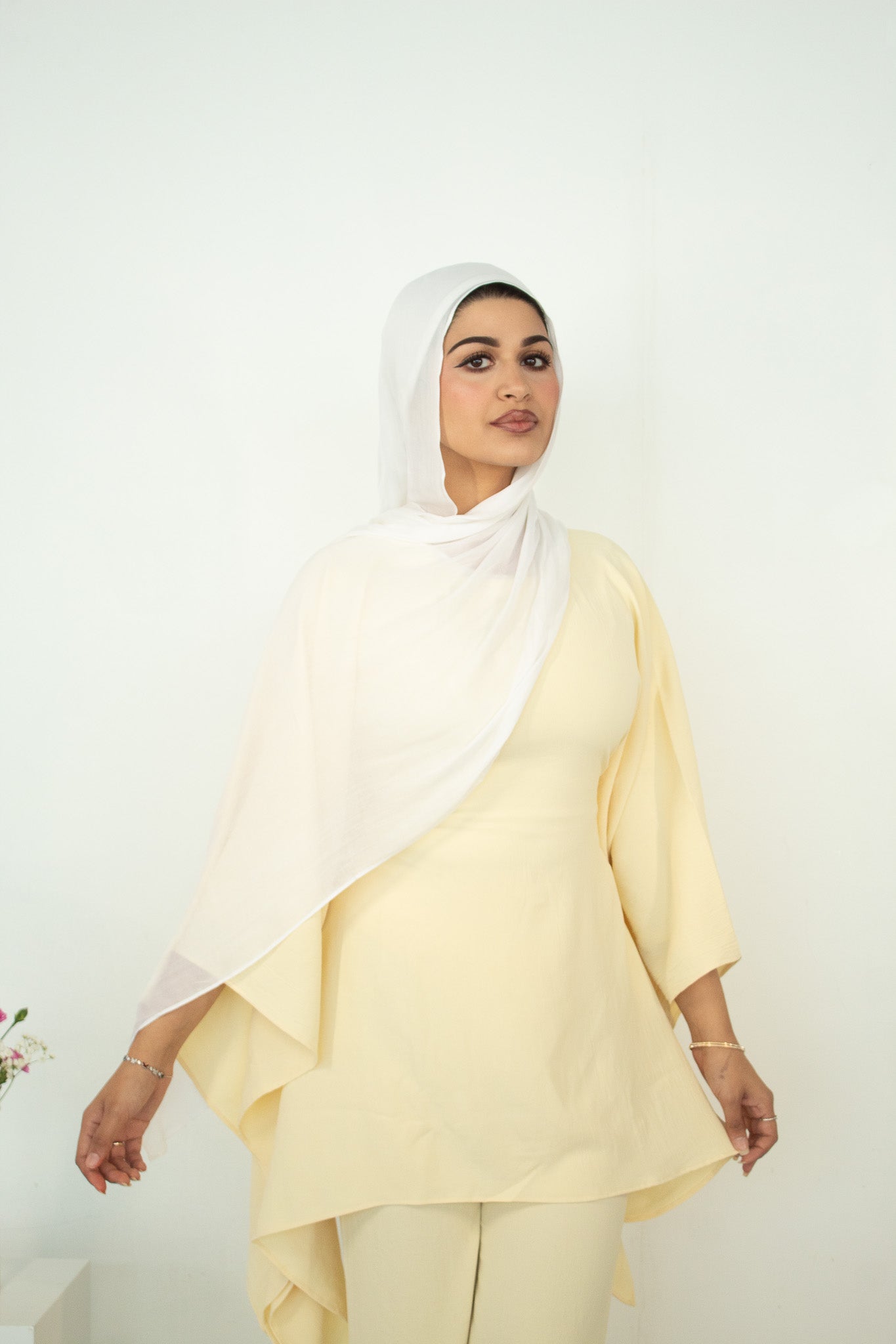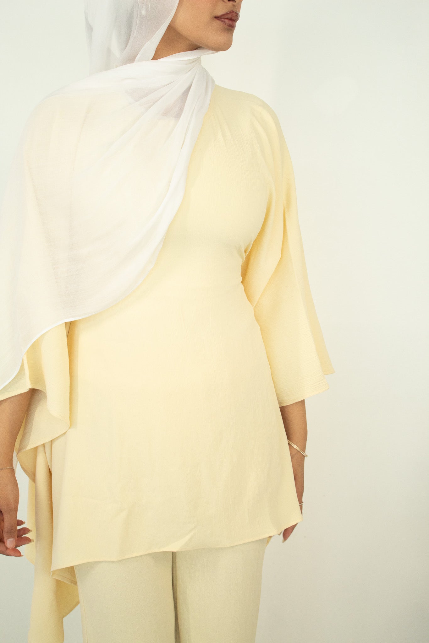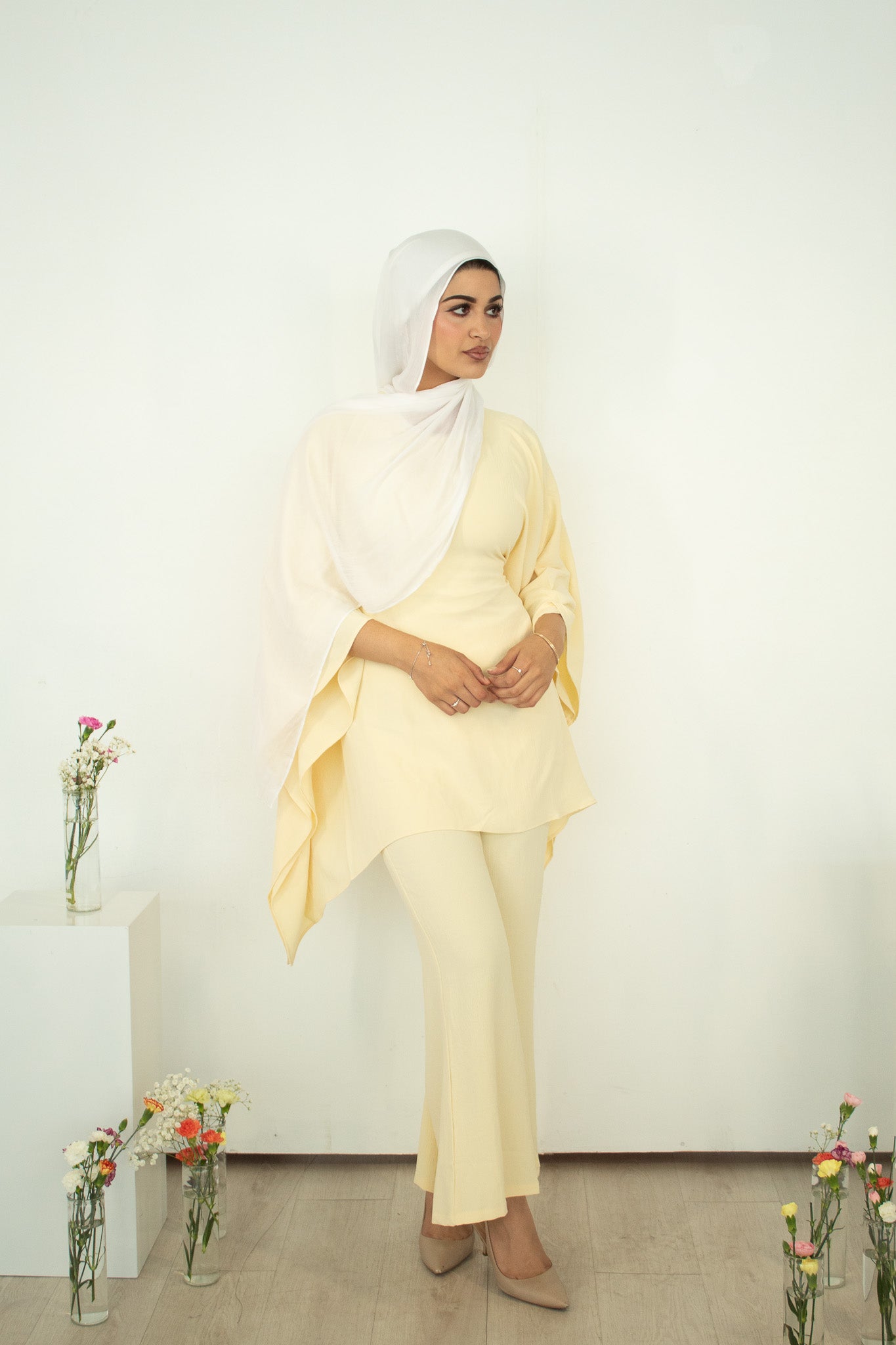 A graceful blend of comfort and sophistication — the Farasha Two Piece Set is a modern essential with a butterfly-inspired silhouette. Designed in a soft, flowy fabric, the set balances elegance with ease. The top features a flattering adjustable fit with an inner tie and back zipper, while the wide-leg pants create effortless movement with every step. A versatile look for occasions, gatherings, or elevated everyday wear.