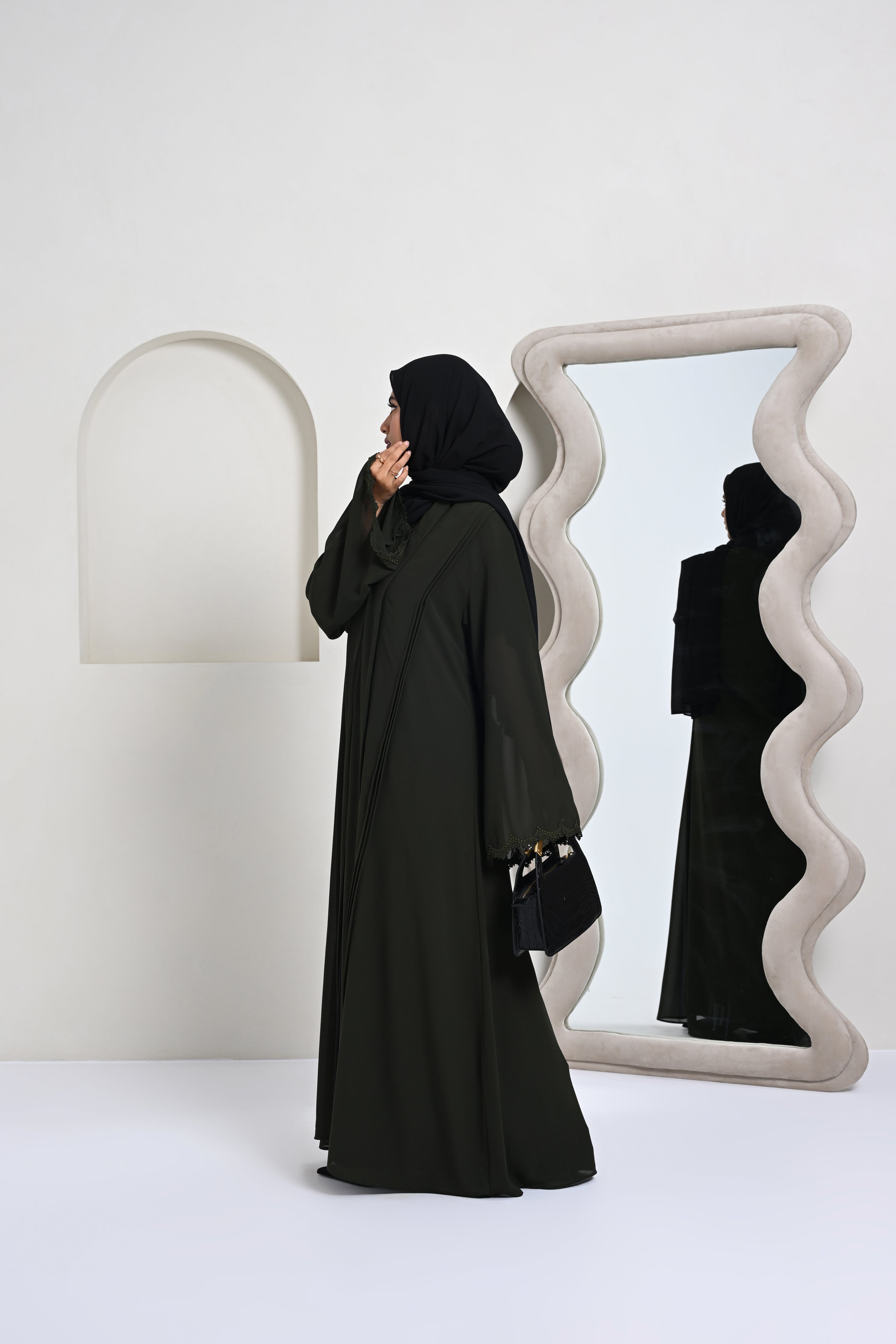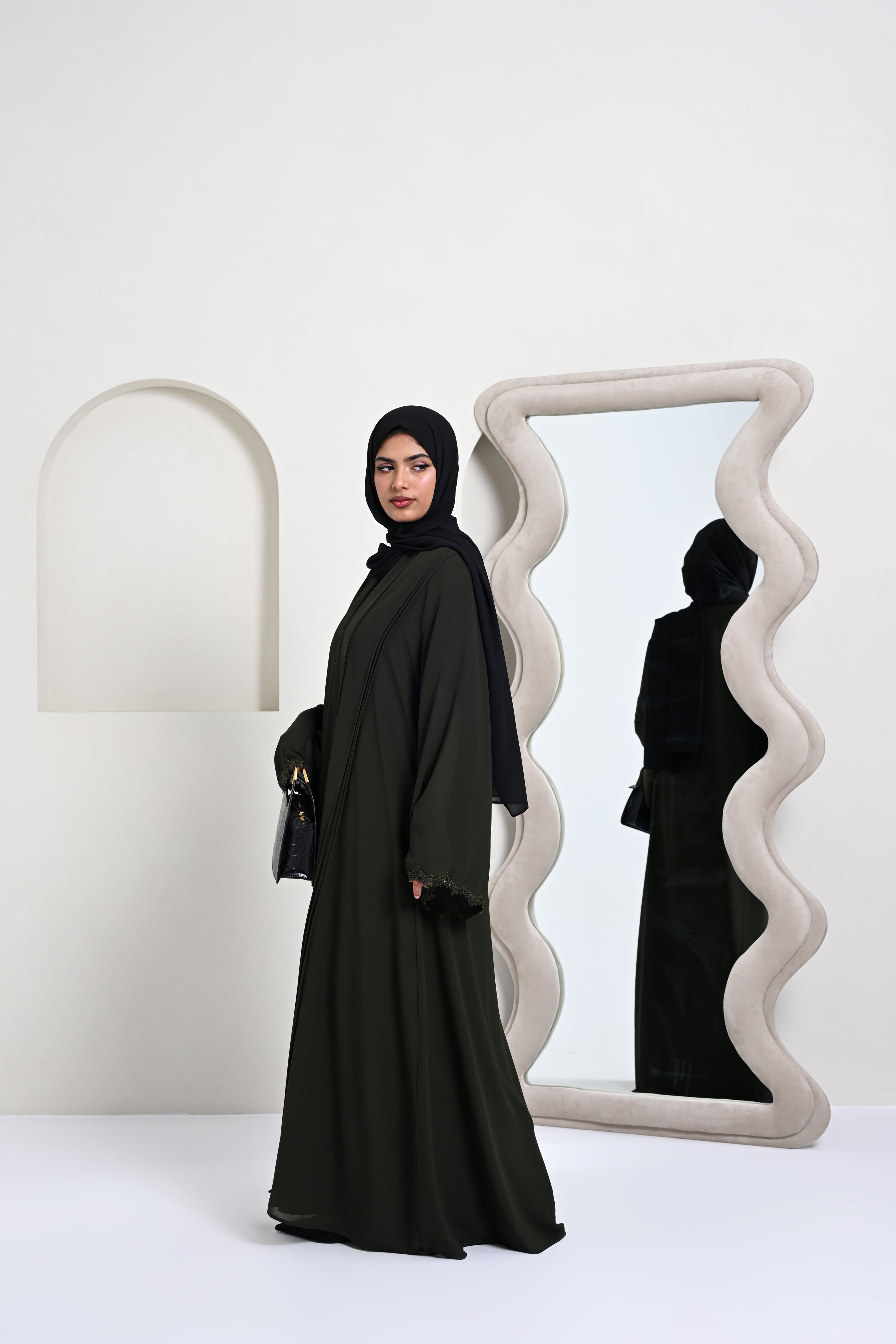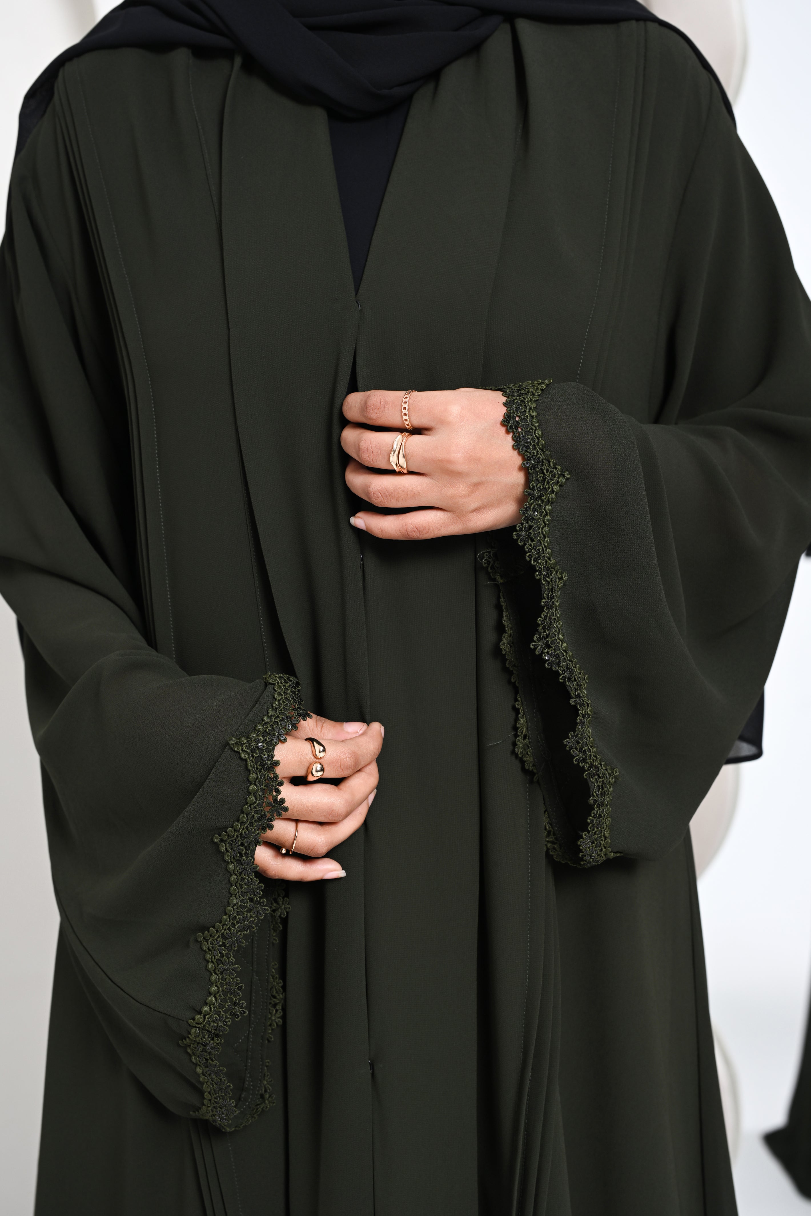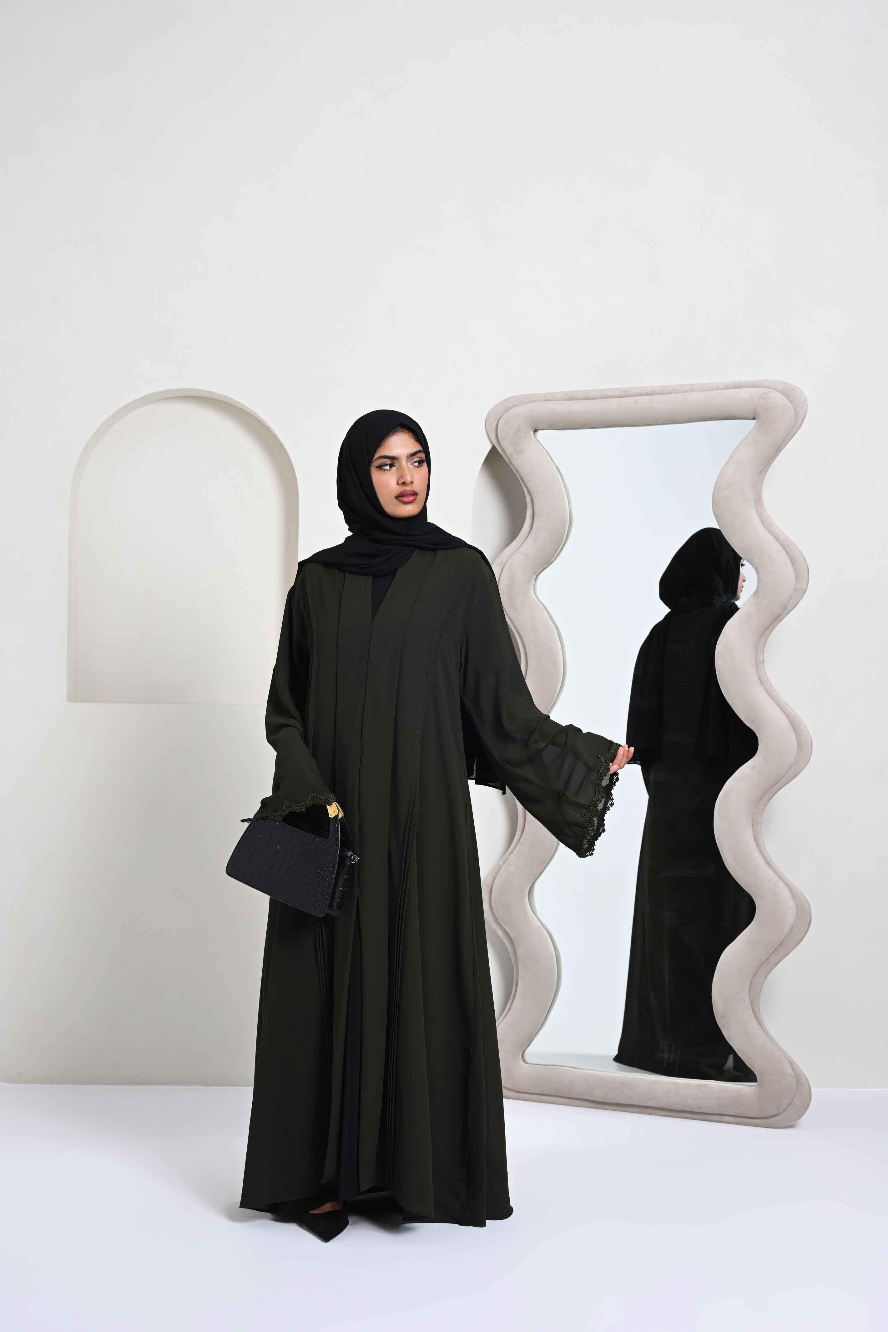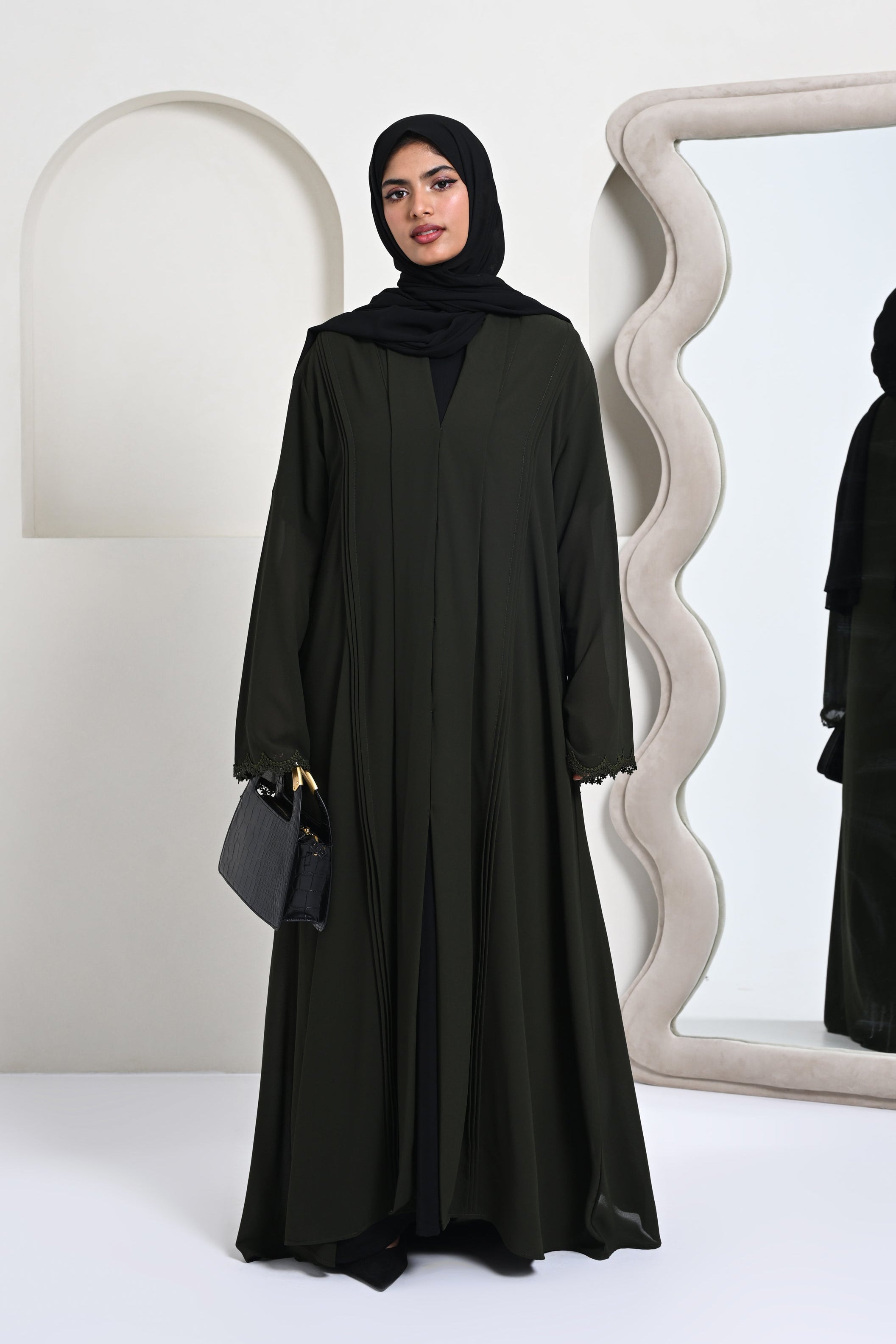 A modern abaya featuring fine pintucks paired with a soft shawl collar.