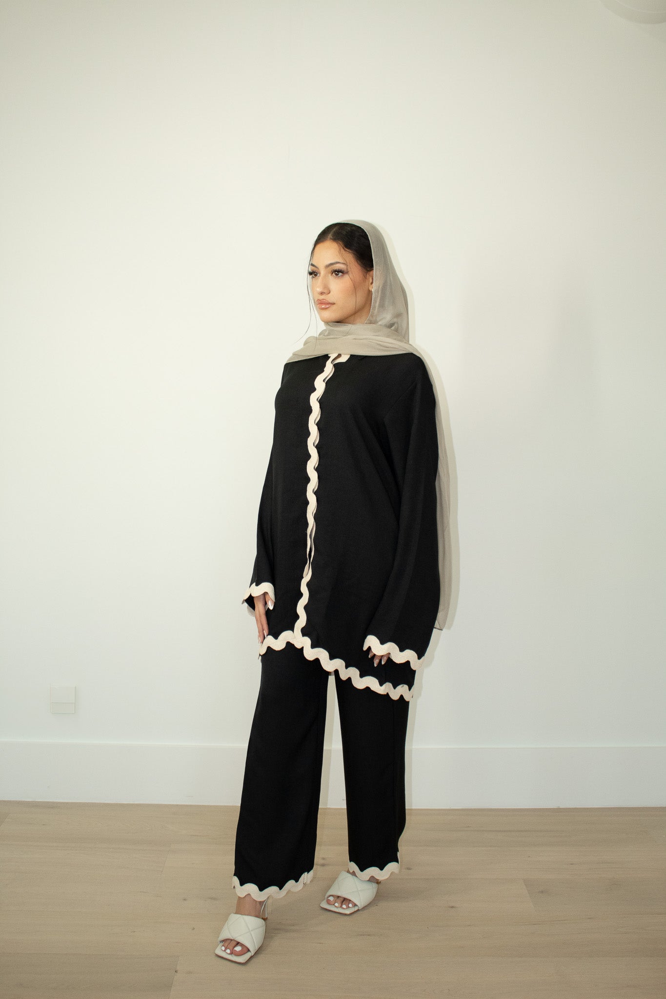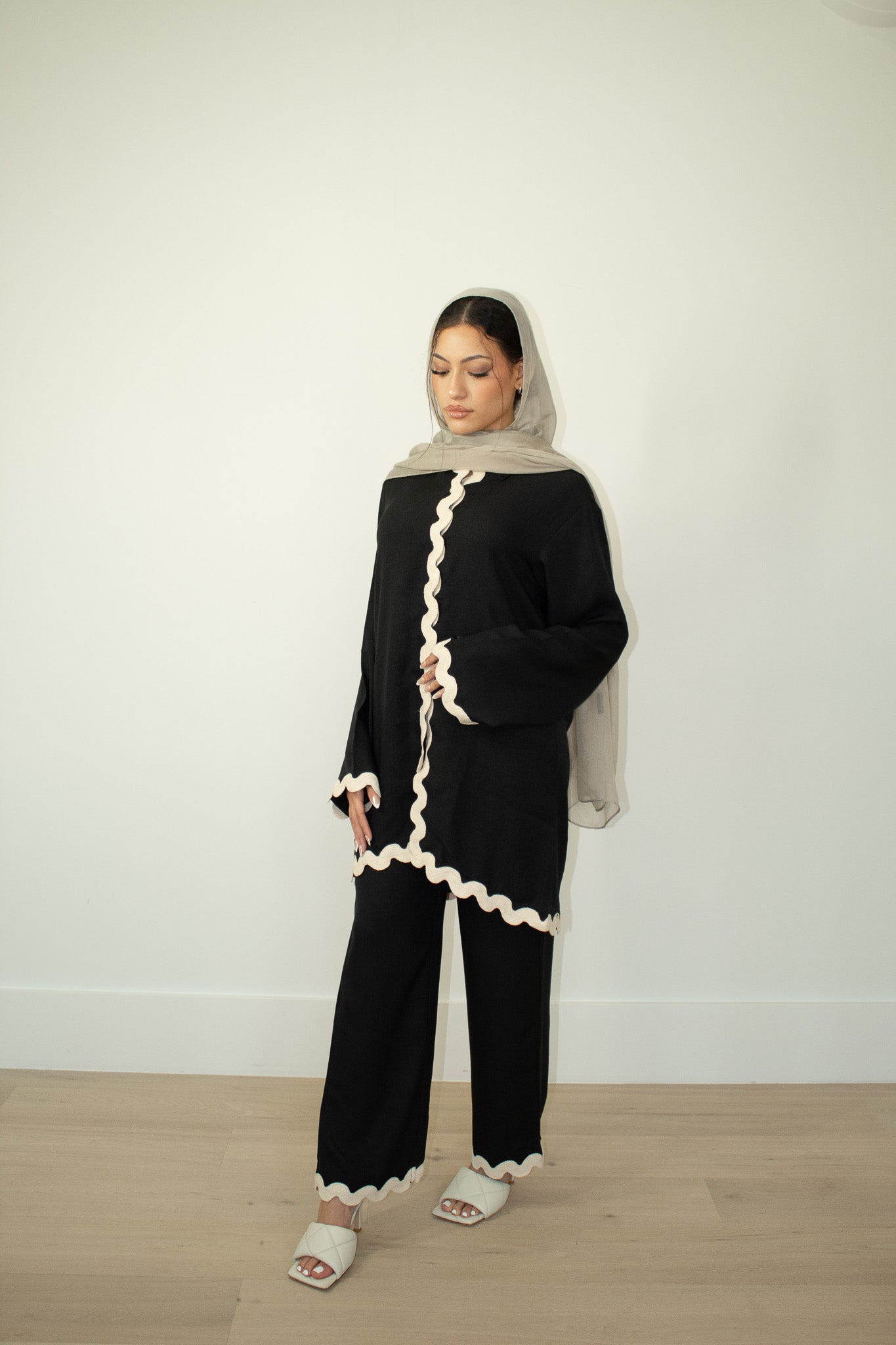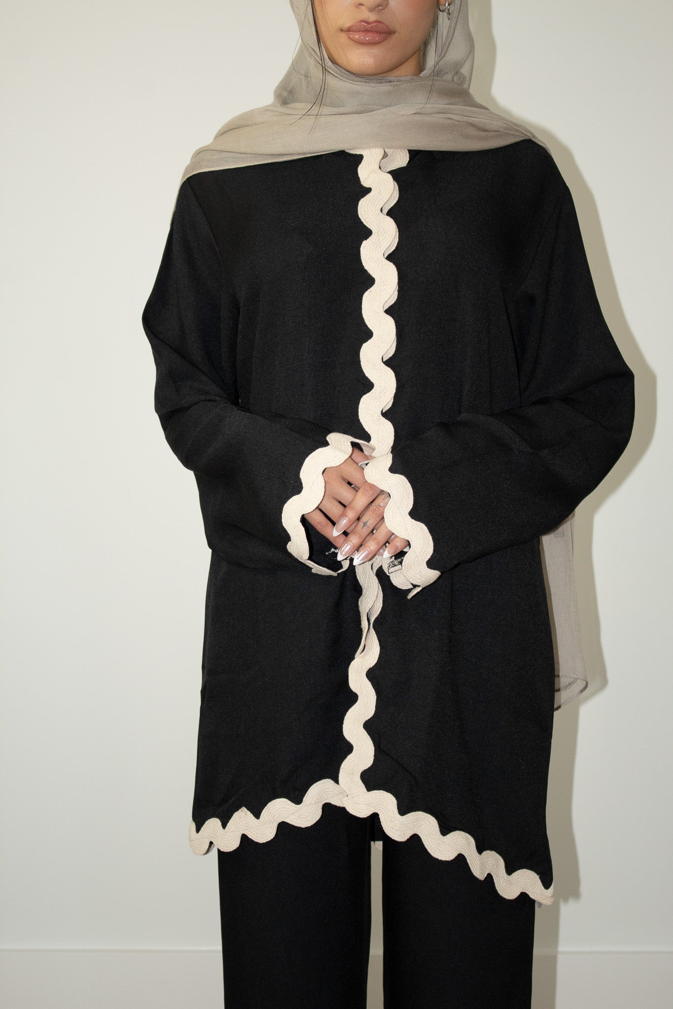 Elevate your everyday look with the Sadaf Scallop Edge Button Set — a perfect blend of structure and softness. This two-piece set includes a tunic-style top with a button-down front and matching wide-leg trousers, both accented with playful scallop-edge detailing. The contrasting trim adds a bold yet elegant touch to a minimal silhouette, making it the perfect outfit for both casual and elevated settings.