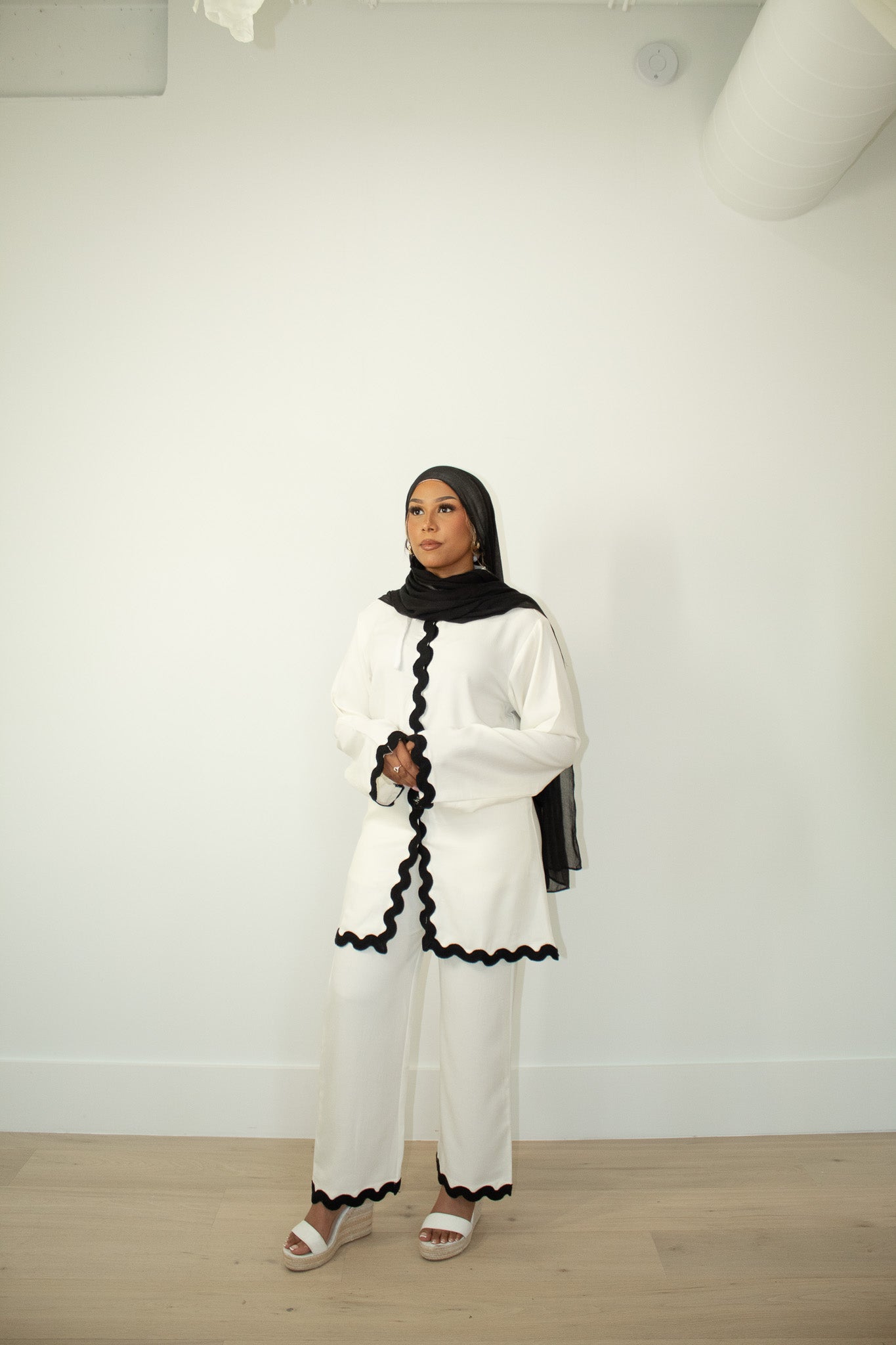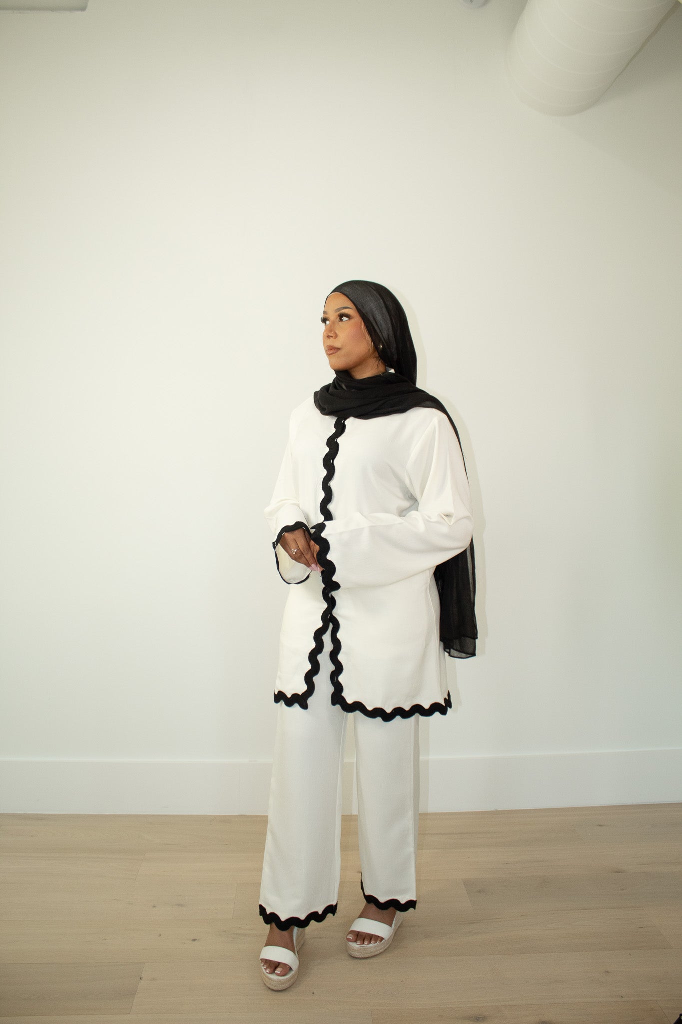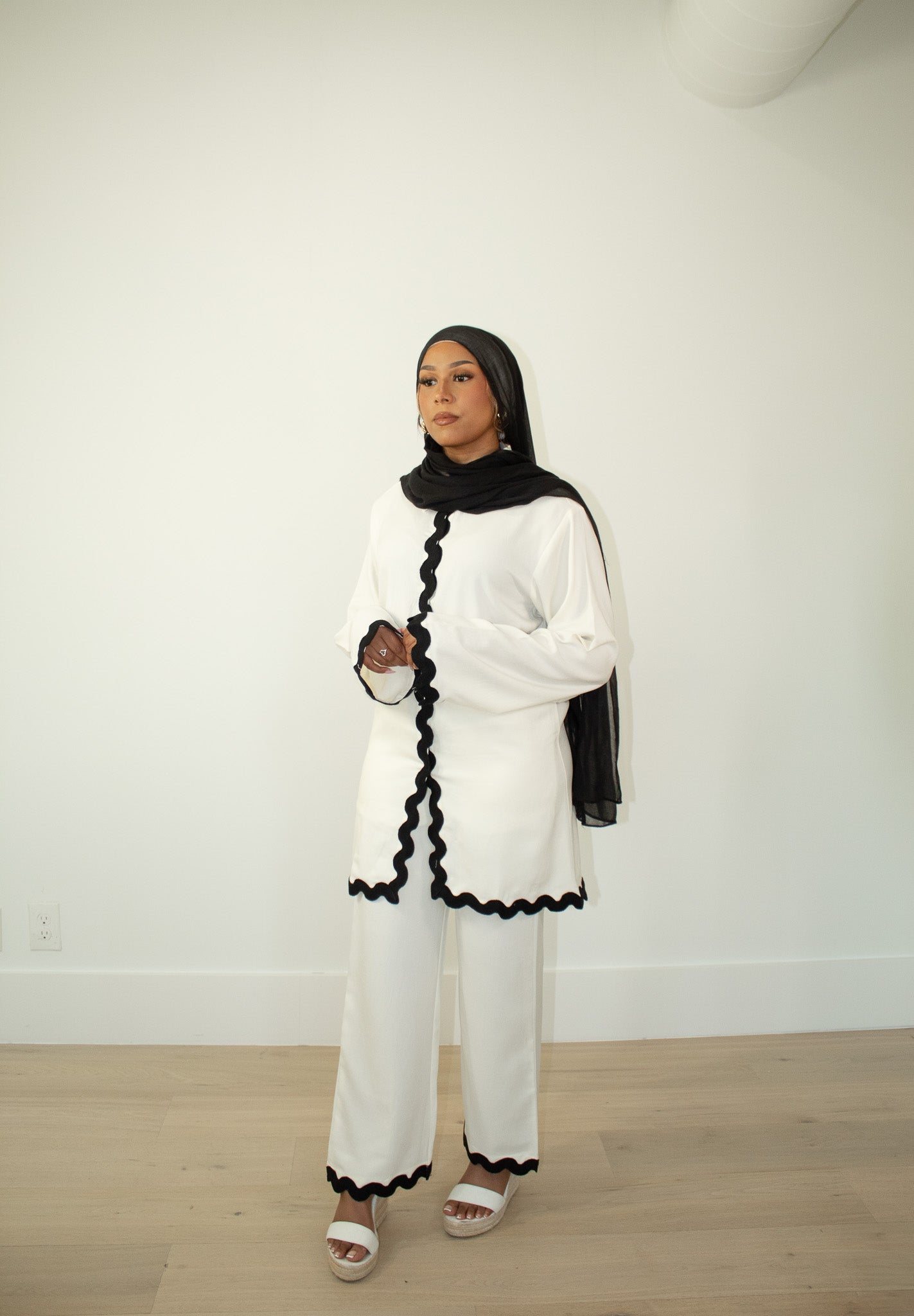 Elevate your everyday look with the Sadaf Scallop Edge Button Set — a perfect blend of structure and softness. This two-piece set includes a tunic-style top with a button-down front and matching wide-leg trousers, both accented with playful scallop-edge detailing. The contrasting trim adds a bold yet elegant touch to a minimal silhouette, making it the perfect outfit for both casual and elevated settings.