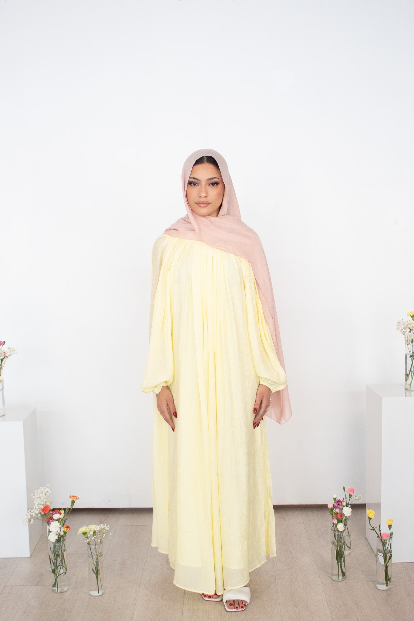 A romantic take on effortless elegance — the Warda Dress is a timeless piece with refined details and a graceful flow. Designed for breathable comfort, this dress features balloon sleeves with an elastic wrist, a ruffled high neck, and a button enclosure at the back. Each dress comes with a matching inner for added coverage, making it a versatile choice for both gatherings and everyday wear.