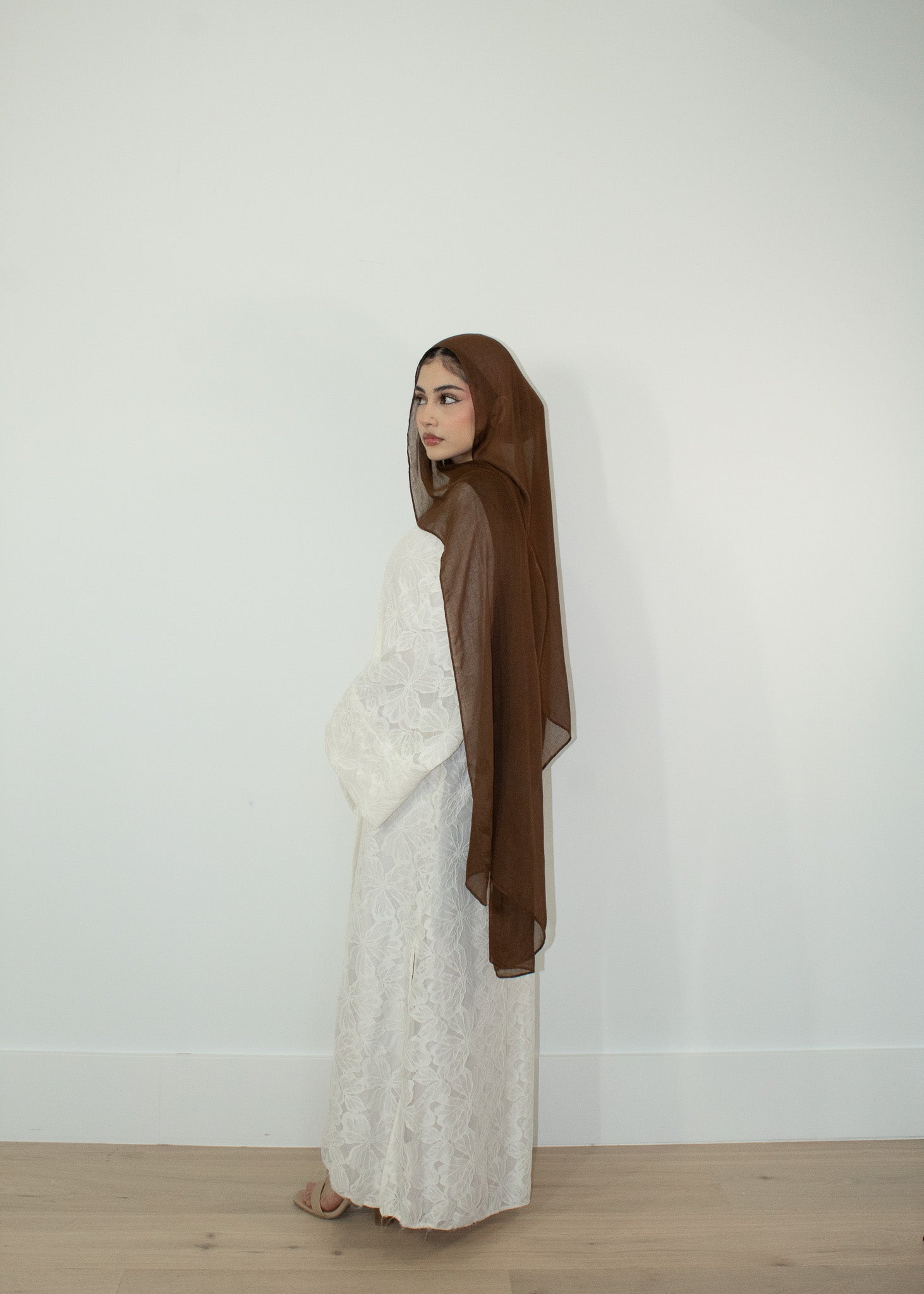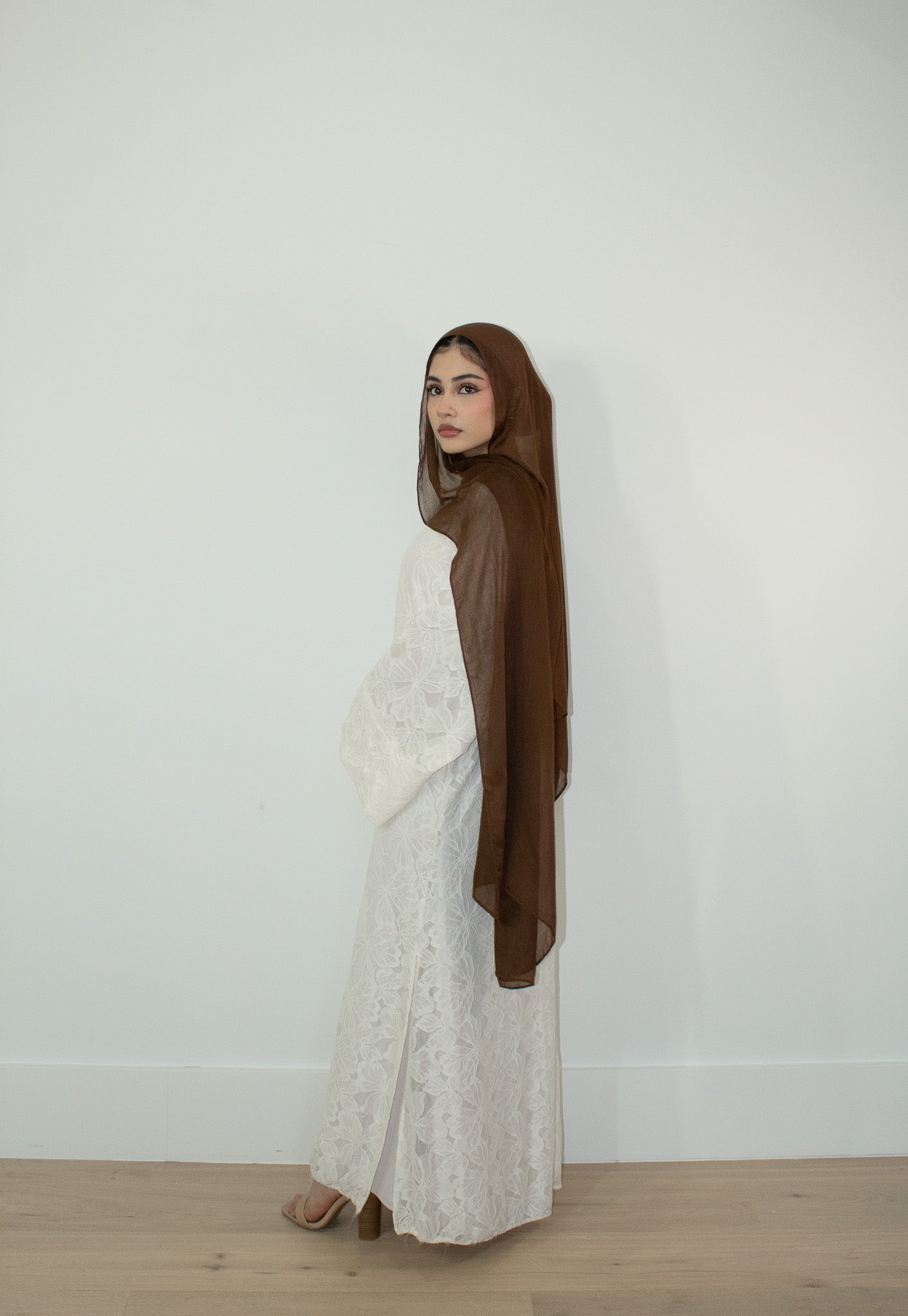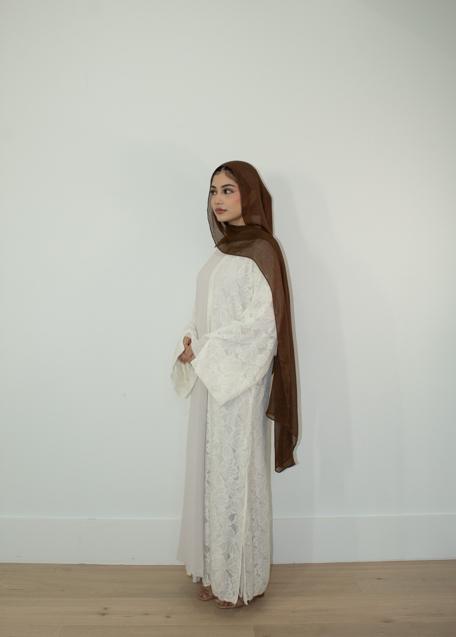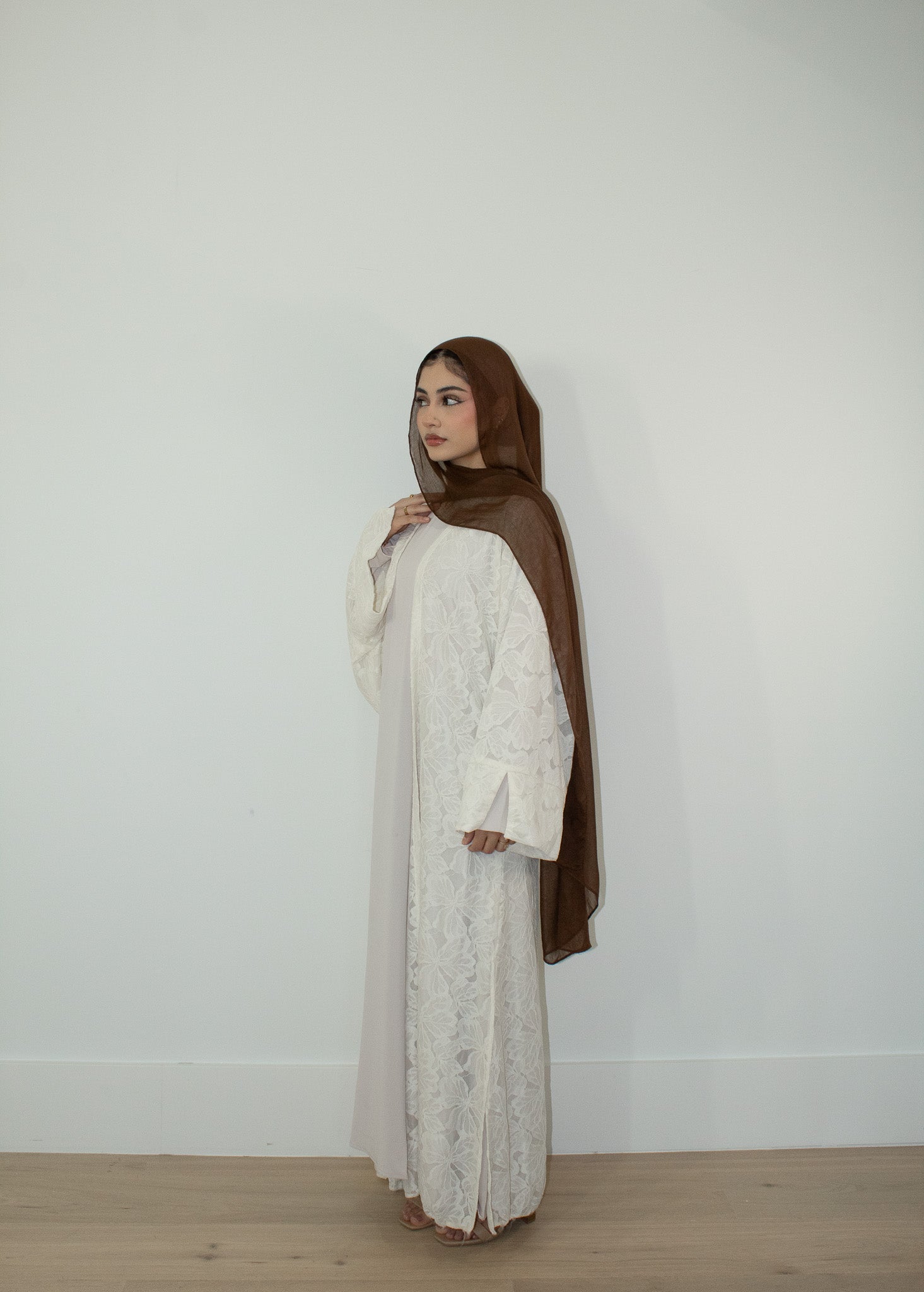 Gracefully refined and effortlessly feminine, our Zahra Floral Open Abaya Set is your go-to ensemble for elegance with ease. Featuring a delicate floral lace overlay and a matching full sleeve inner slip dress, this set blends modesty with luxury. The wide sleeves and open-front design give it a timeless silhouette, perfect for formal gatherings and special occasions.